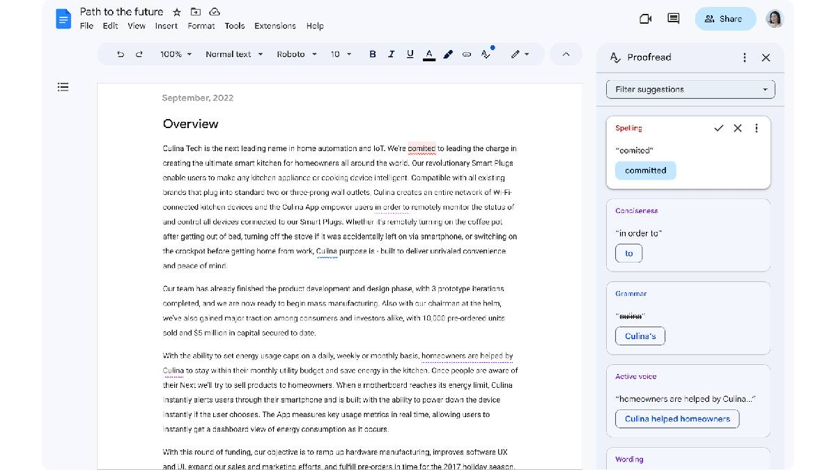 These suggestions will not clutter users' documents as they will appear on a Proofread sidebar on the right of the screen. Users can review these suggestions directly from the sidebar and can decide on appropriate suggestions according to their preferences. They can also customise the type of suggestions from the filter option provided at the top of the sidebar to get more relevant suggestions.