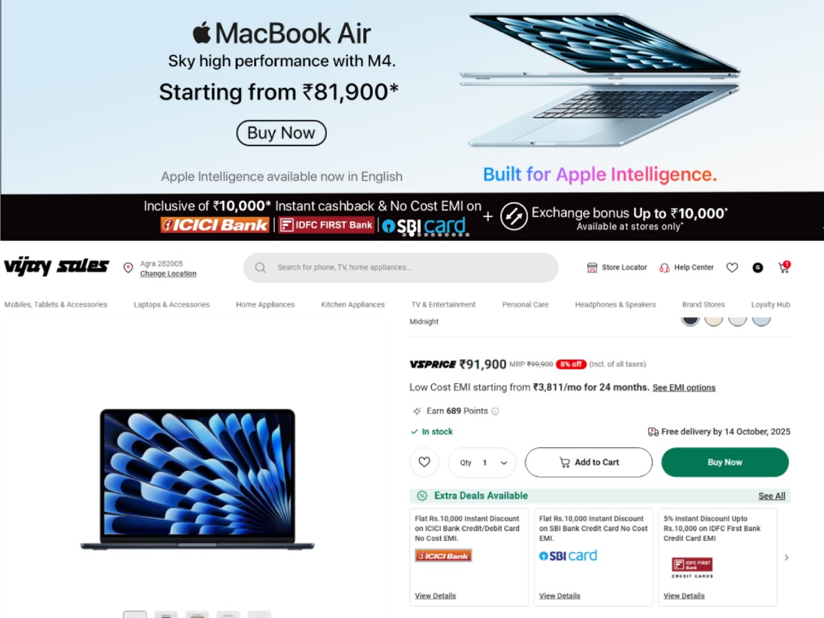 Apple’s latest MacBook Air M4 is now available with a massive discount on Vijay Sales, giving buyers total savings of up to Rs 17,910.