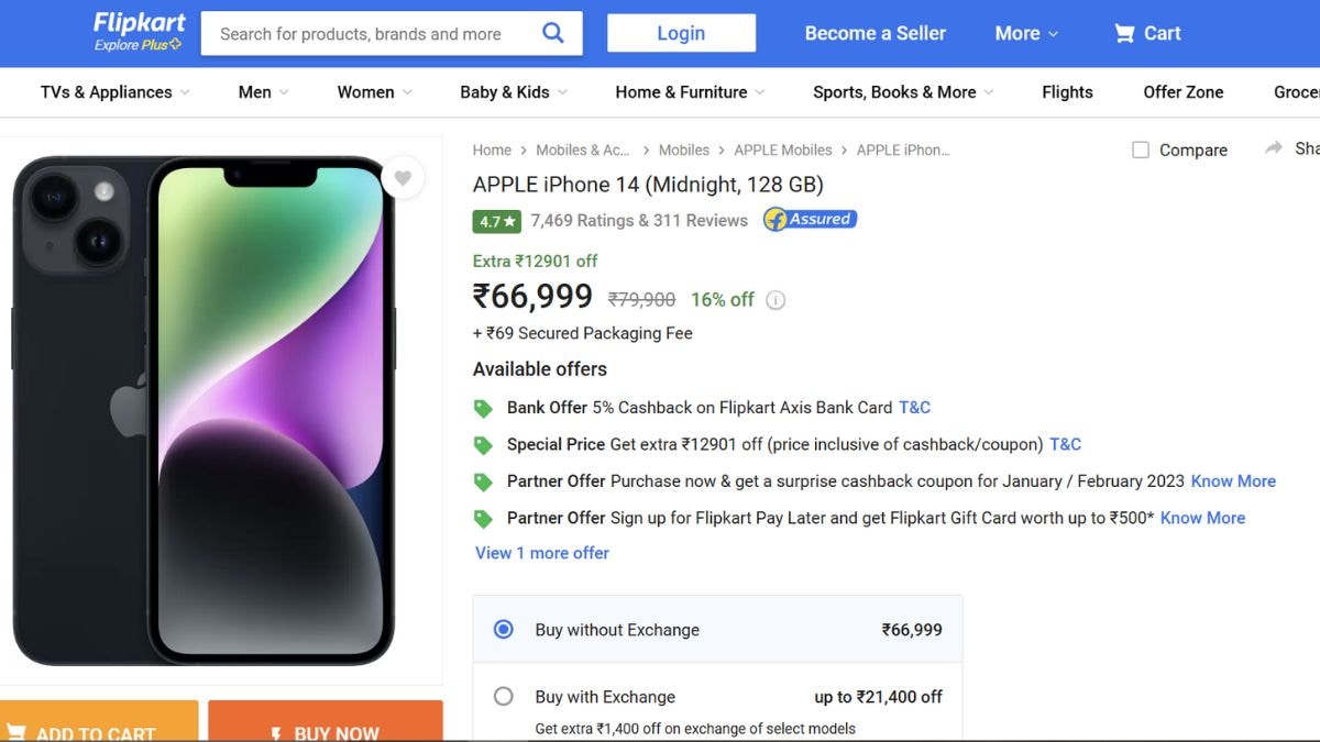 Apple released the iPhone 14 lineup in September last year and the most popular models have been mainly the Pro iPhones. Apple iPhone 14 with 128GB storage is currently listed at Rs 66,999 on Flipkart after Rs 12,901 discount. One can get 5 percent cashback on Flipkart Axis Bank Card. In addition, Flipkart is offering up to Rs 21,400 off in exchange for your old smartphone. This means one can get the Apple iPhone 14 in just Rs 45,590 from Flipkart.