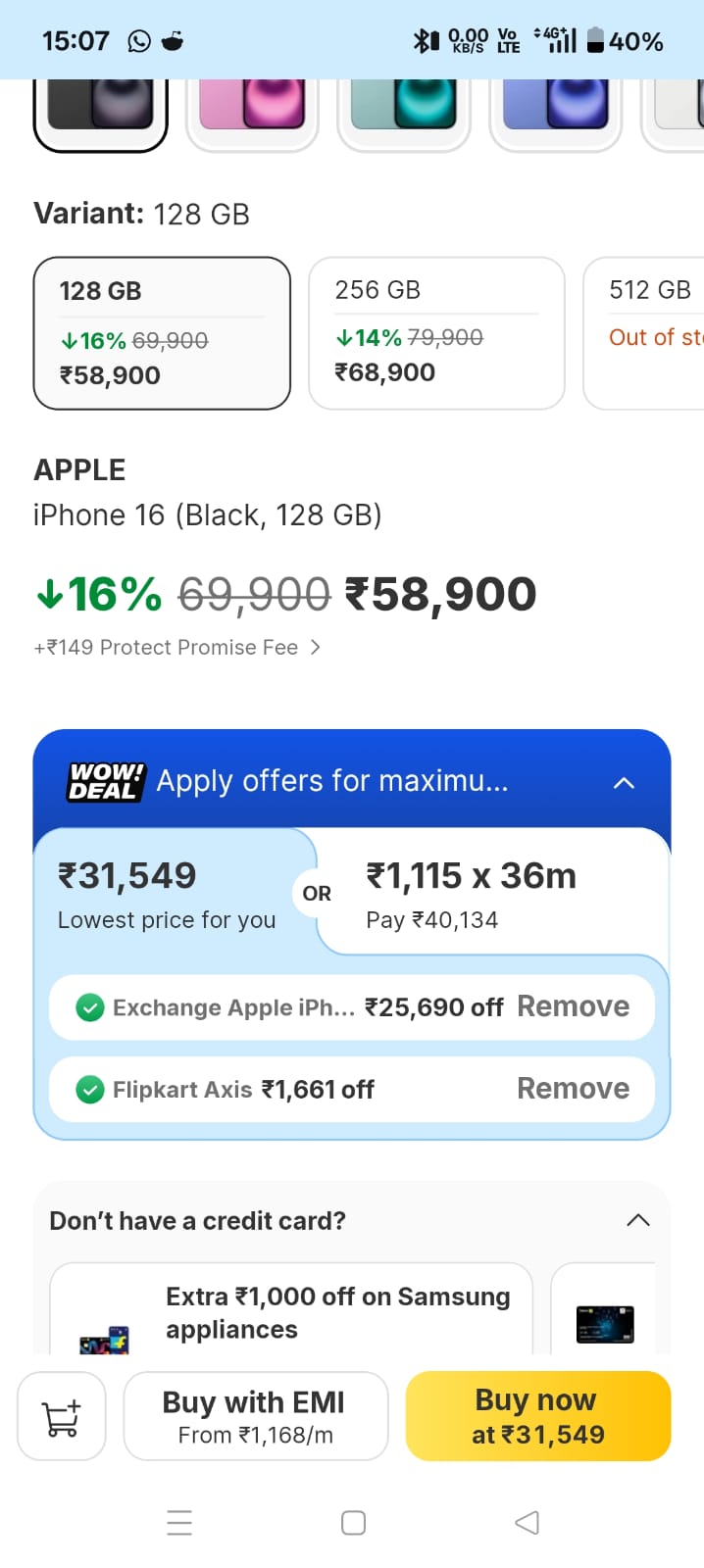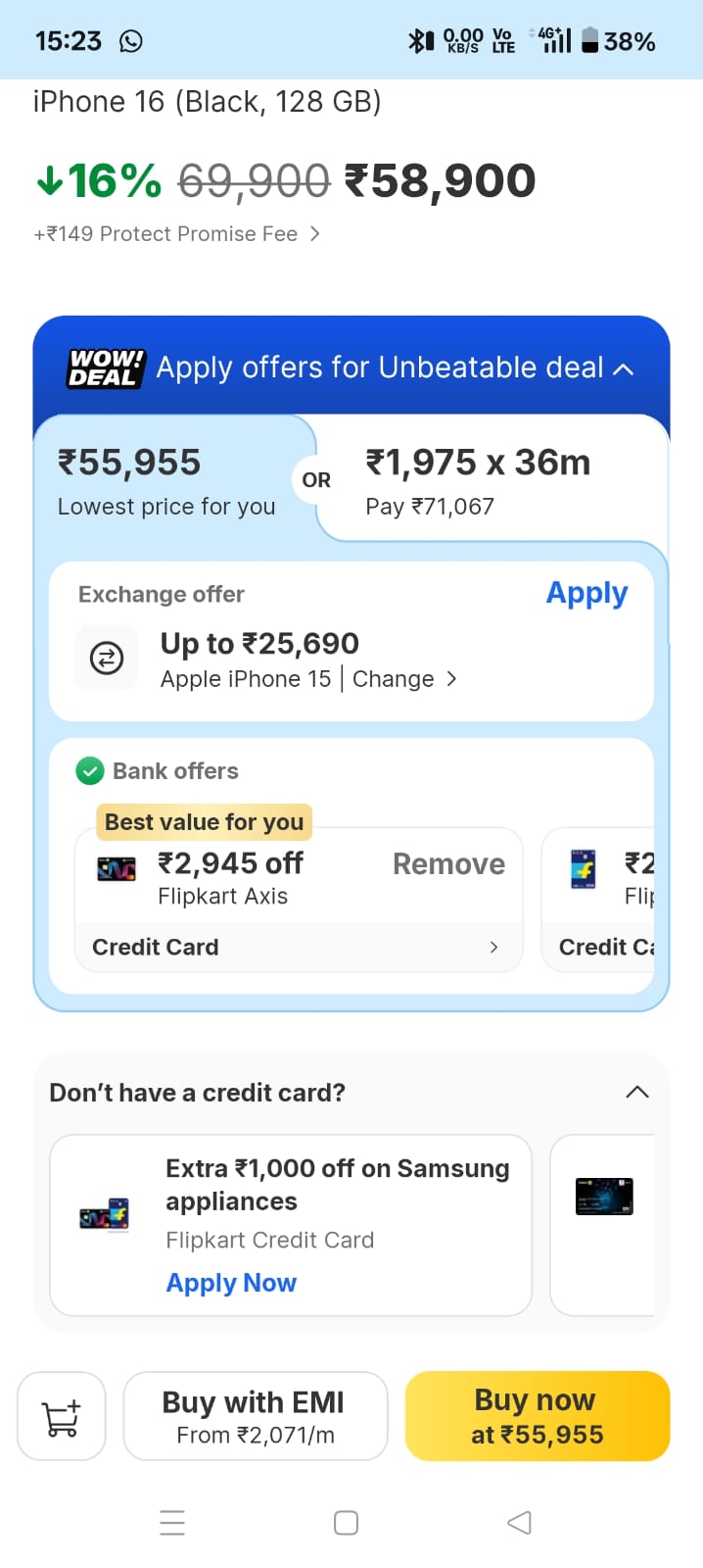 Even if you don't have the iPhone 15 for the exchange, you can get around Rs 2,945 off on the Flipkart Axis and Flipkart SBI bank credit card. This will cost you around Rs 55,955.