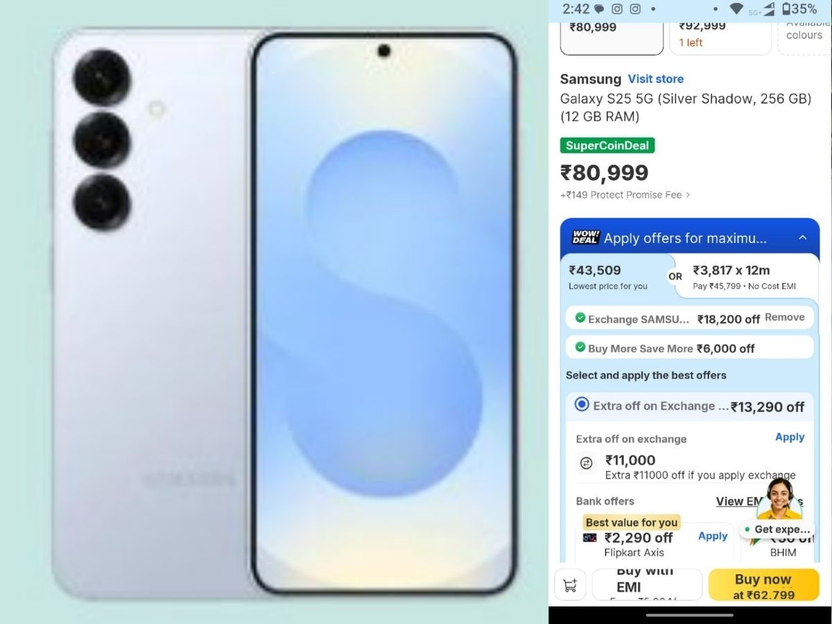 The Samsung Galaxy S25 5G was launched at a price of Rs 80,999 and now the phone can be yours for as low as Rs 68,050. But, this involves a mix of bank discounts and exchange offers. The flagship phone is available on Flipkart with an exchange bonus of Rs 11,000 and a standard card discount of Rs 2,095. On top of that, the value of your old phone also counts toward the deal. For example, exchanging an old S23 brings down the overall cost even further. There’s also a running Buy More, Save More offer, where carts above Rs 15,000 get an additional Rs 6,000 off. When all of these are combined, the effective price of the Galaxy S25 5G drops to as low as Rs 43,509. Also Read: OnePlus 13s Review: A Mini Phone with Mighty Power