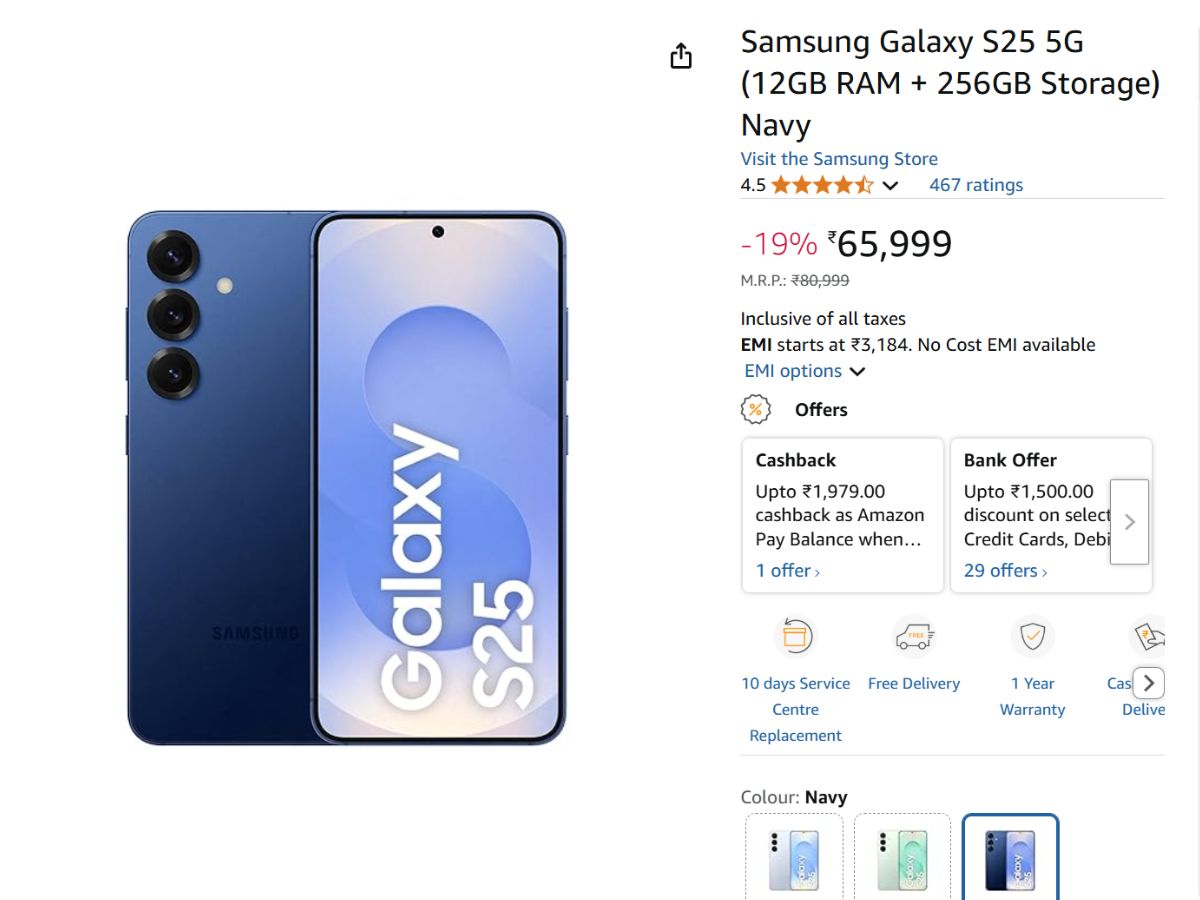 Samsung Galaxy S25, initially launched at Rs 80,999 for the 256GB storage model, is currently listed for just Rs 65,999 on Amazon. That's a massive saving of Rs 15,000 on a flagship. On top of that, Amazon Pay ICICI Bank credit card users can avail a cashback of Rs 1,979 on their purchase.