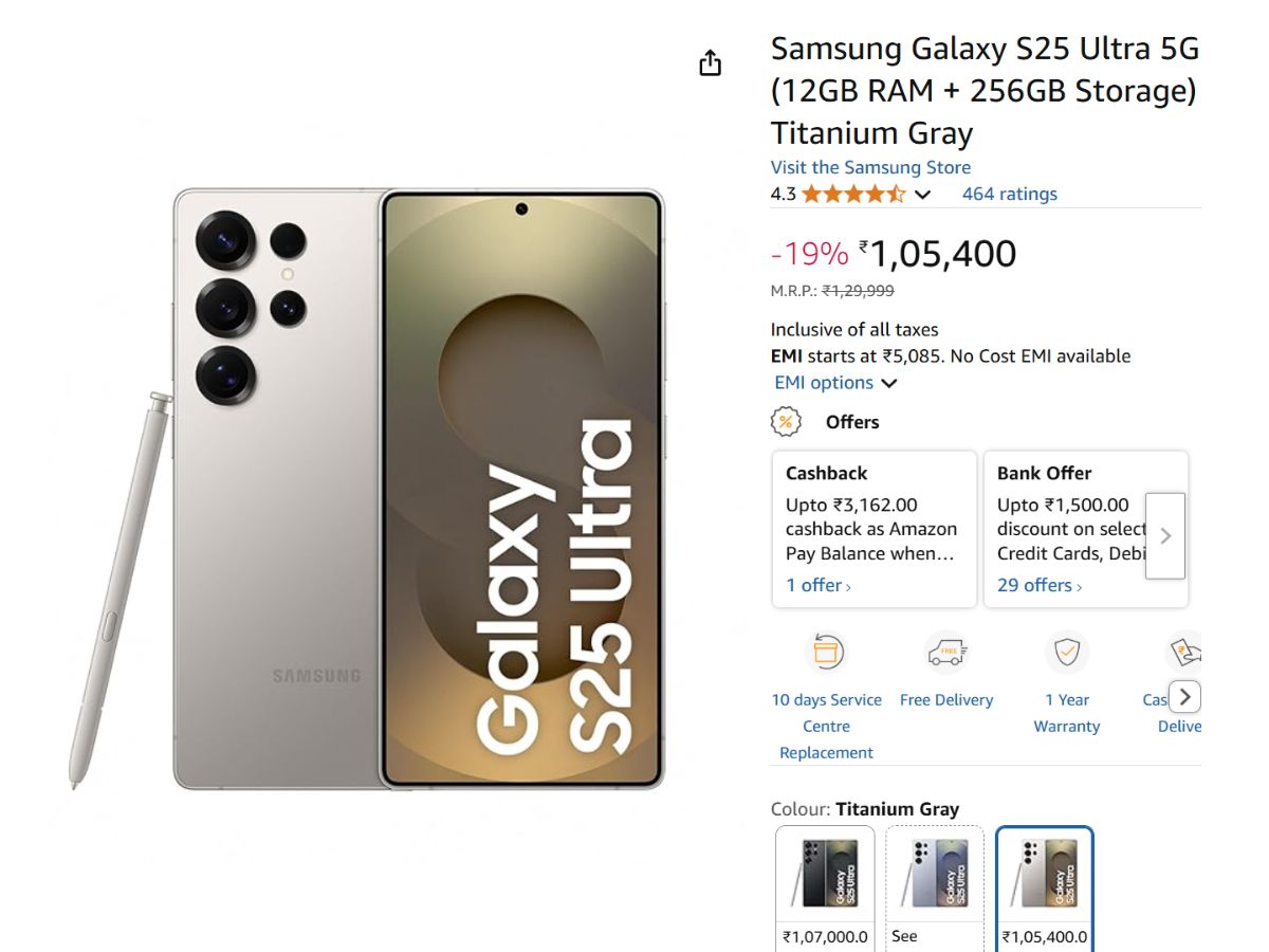 Buyers with an Amazon Pay ICICI Bank credit card can avail an additional cashback of Rs 3,162 on purchasing the Galaxy S25 Ultra.