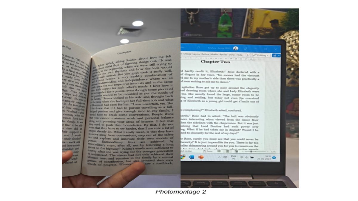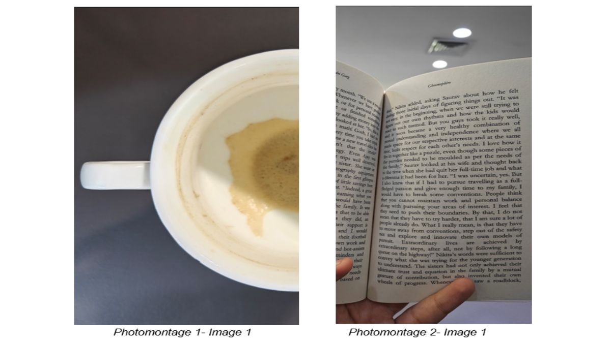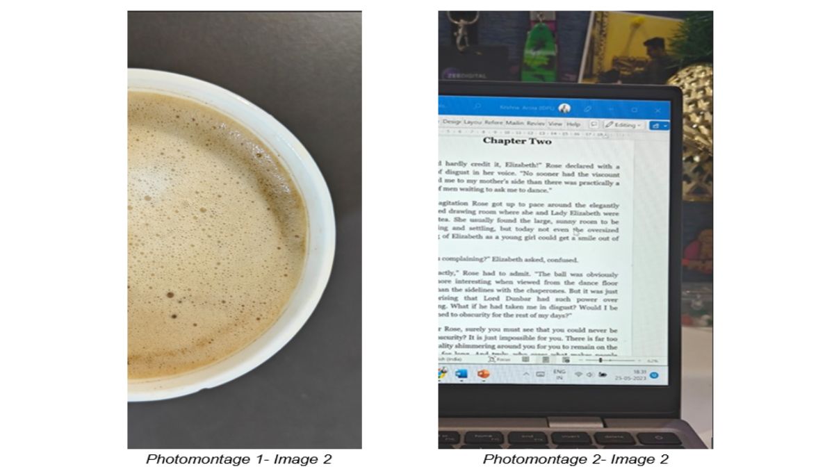 For Image 2 of Photomontage 1, we have gone ahead with a fully-filled cup of coffee, and for Image 2 of Photomontage 2, we have selected an image of the electronic version of a book while reading on a laptop.