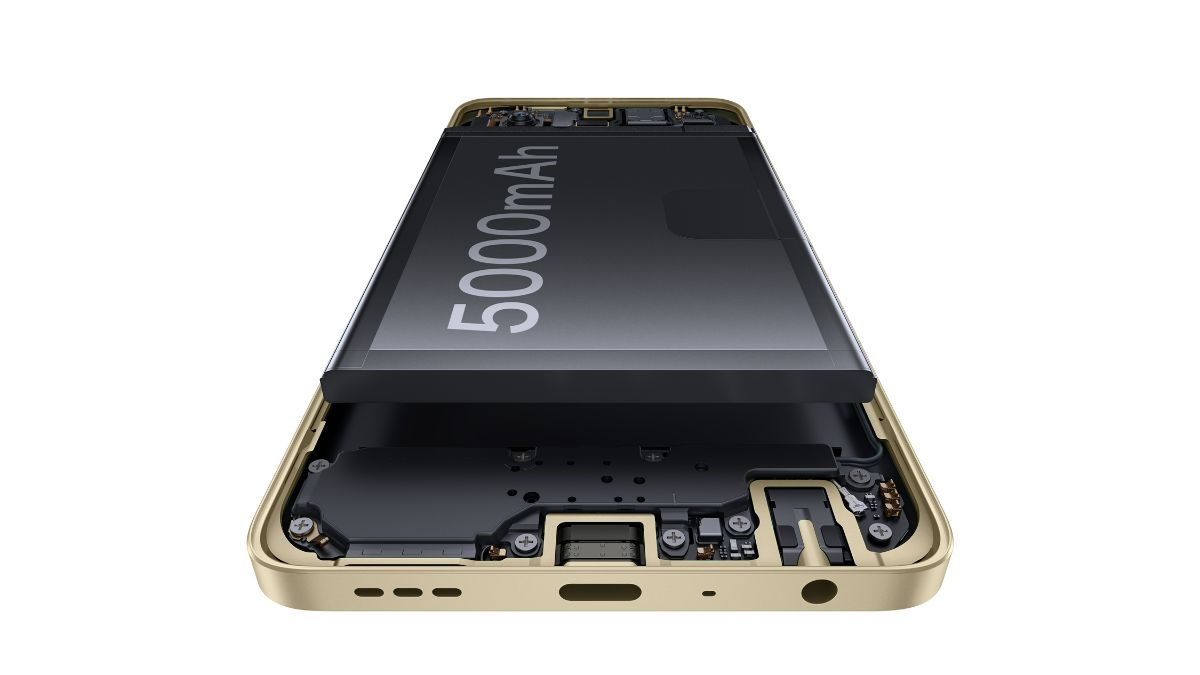 The rear design is distinctive, especially this Bold Gold colour stands out. The camera module gives you an impression of a two-lens setup, but you get a 3-Lens setup and the decorative ring around the camera helps give the device a premium look.