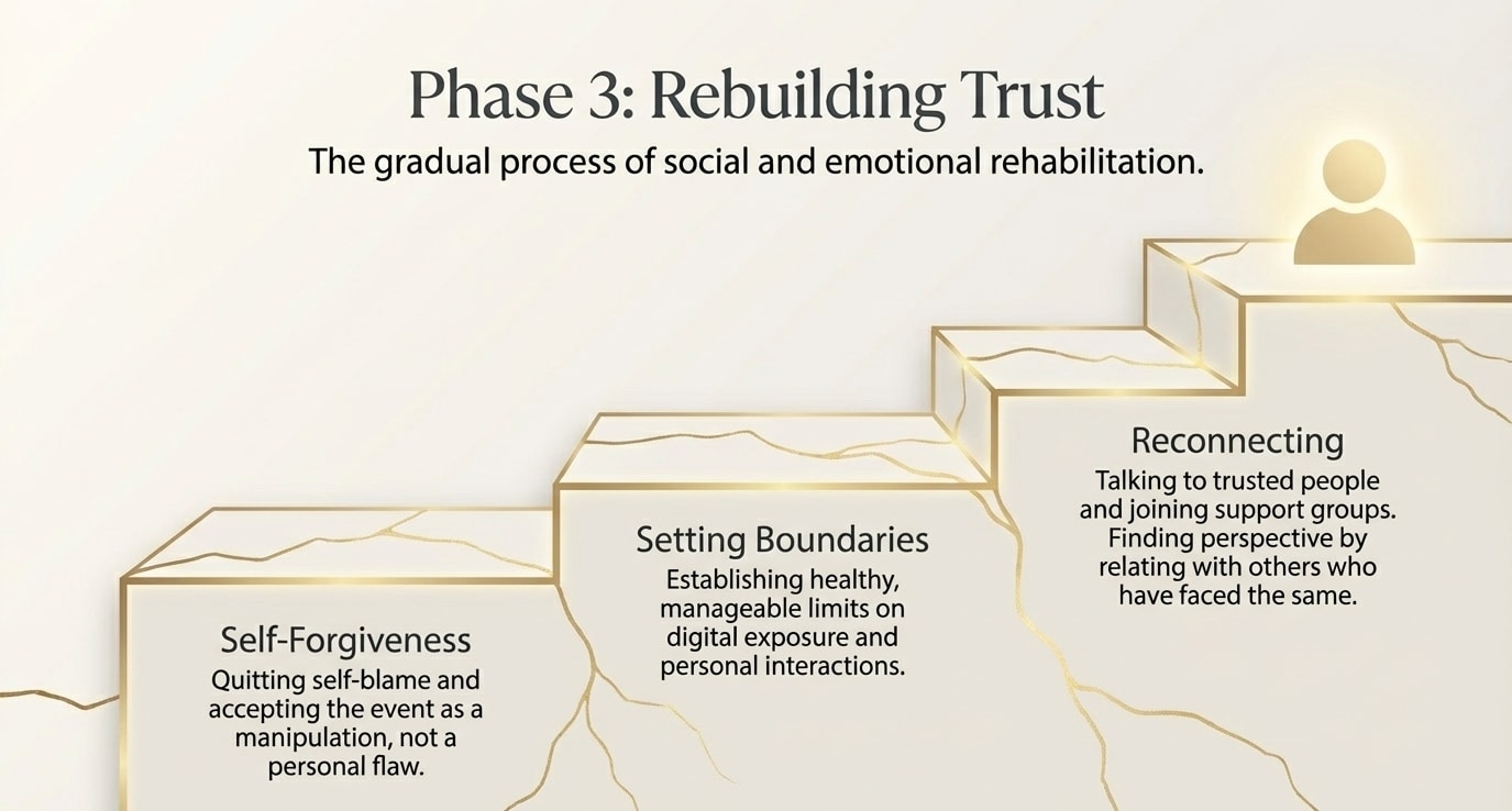 The recovery process of a scam requires self-care. Sleep properly, eat properly, exercise, and breathe deeply. Anxiety can be reduced through cognitive methods such as doubting negative thoughts or postponing decision-making. Rebuild trust in other people over time and establish healthy boundaries.