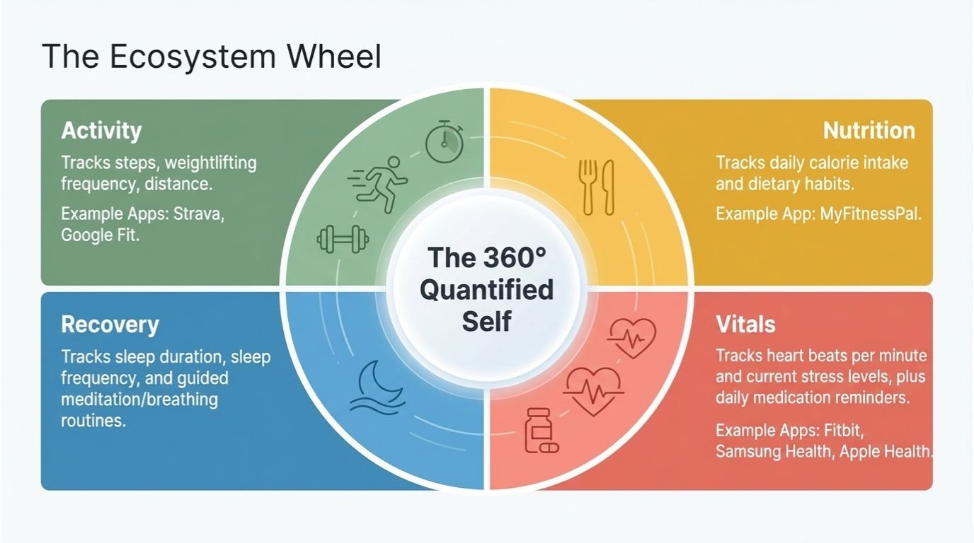 Today, there are health-related apps for everything. We can use an app to track how many steps we take, how often we lift weights, track our calorie intake, how often we sleep and for how long, our heart beats per minute, and our current stress level. Apps like Fitbit, Samsung Health, and Strava are commonly used for tracking workouts and activity, while others focus more on nutrition and lifestyle. Additionally, many of these apps have additional features, such as providing daily reminders for medication and offering guided routines for meditation and breathing exercises.