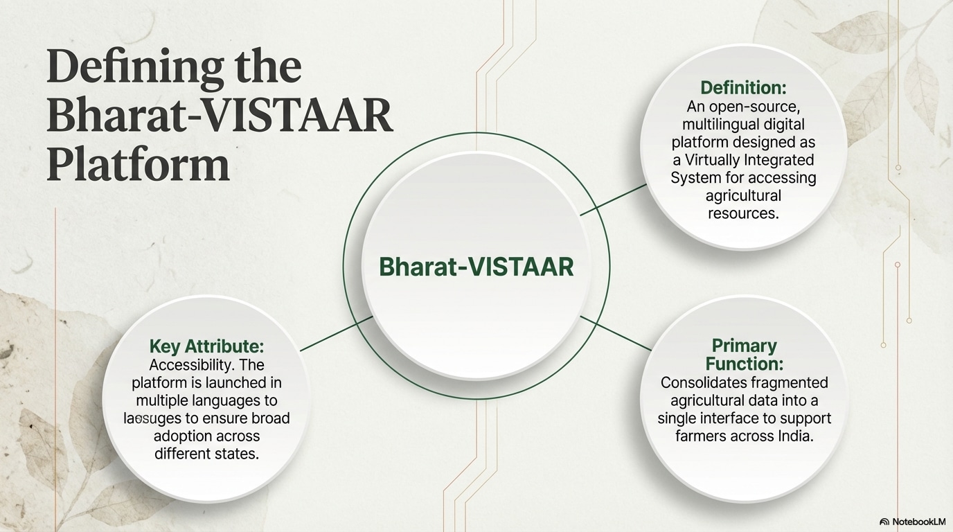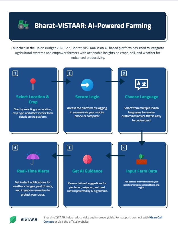 Bharat-VISTAAR is an artificial-intelligence based tool launched by Government of India in the Union Budget 2026-27. The open-source digital platform is a multilingual tool that will help in integrating existing government agricultural systems. The tool will integrate AgriStack portals and the Indian Council of Agricultural Research (ICAR).