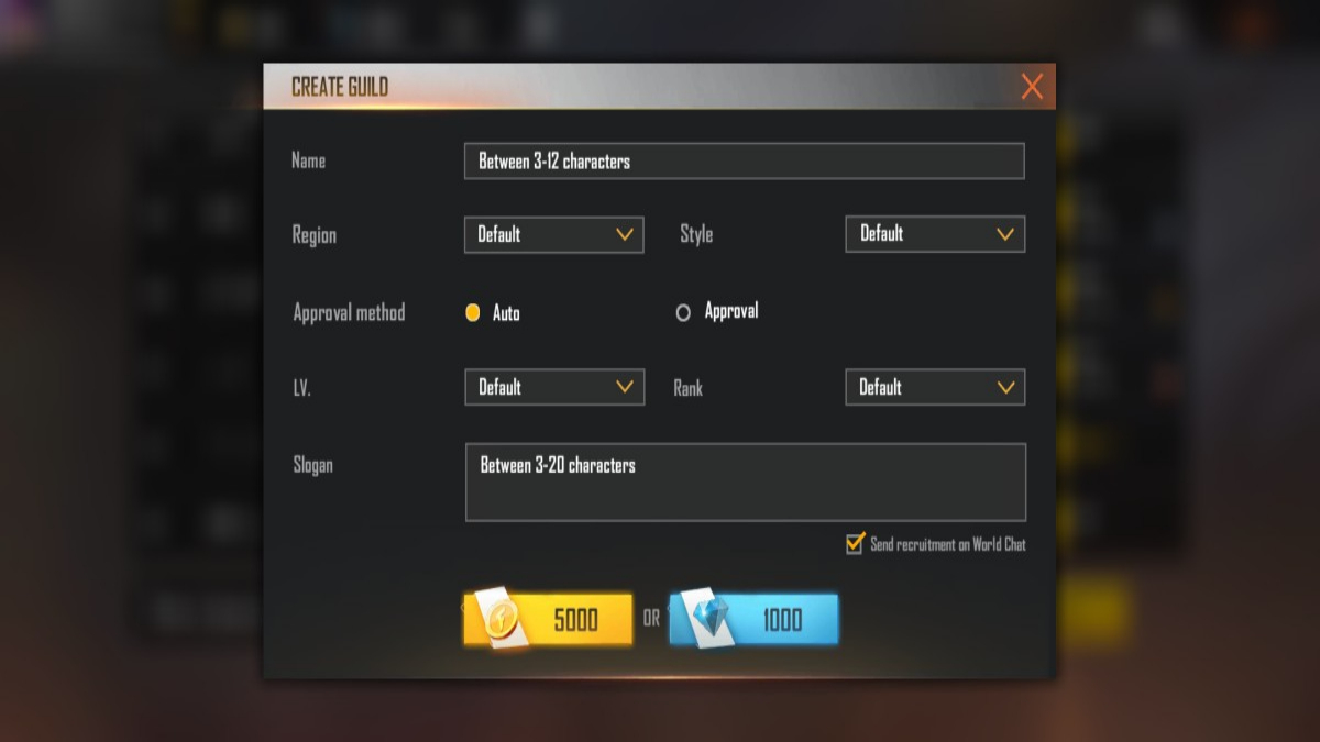 Step 5: Fill in the asked information, which includes name of the guild, region, style, approval method, LV, rank and the slogan for your guild.