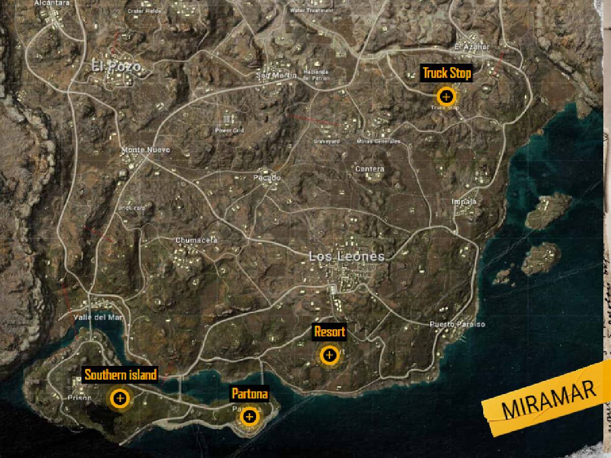 Miramar is a vast desert map featuring long sightlines, sparse vegetation, and scattered settlements. Given the map's large size and open spaces, vehicles are essential for quick travel. Always be on the lookout for vehicles and keep them in good condition. It is essential to adapt to the Heat. Miramar's heat can make it challenging to stay mobile. Plan your movements carefully and use the map's buildings and natural cover to avoid open areas.