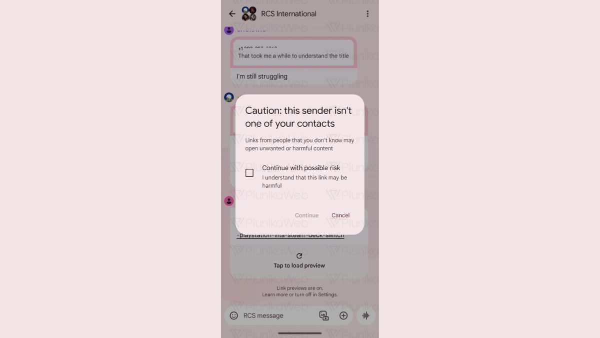 Piunika Web की लेटेस्ट लीक रिपोर्ट में जानकारी दी गई है कि Google जल्द ही नया अपडेट जारी करने वाला है। इस अपडेट का उद्देश्य गूगल मैसेज पर यूजर्स की सिक्योरिटी को बेहतर करना और स्कैम मैसेज को रोकना है। इस अपडेट के जरिए यूजर्स को एक पॉप-अप वॉर्निंग दी जाएगी। यह वॉर्निंग यूजर्स को अज्ञात नंबर से आने वाले मैसेज पर क्लिक न करने की वॉर्निंग जारी करेगा।