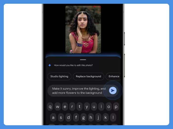 Google ने भारतीय यूजर्स के लिए नए AI-powered एडिटिंग फीचर्स रोलआउट किए हैं। अब भारतीय यूजर्स Google Photos पर वॉइस कमांड देकर अपनी फोटो एडिट कर सकेंगे। अभी तक फोटो एडिट करने के लिए आपको एडिटिंग टूल्स व स्लाइडर्स का सहारा लेना पड़ता था, लेकिन अब नए अपडेट के बाद आप टेक्स्ट व वॉइस के जरिए एक साधारण-सा प्रोम्प्ट व कमांड देकर भी फोटो को एडिट करा सकेंगे। गूगल का यह फीचर Gemini से लैस है, जो कि 4GB RAM व उससे ऊपर के रैम मॉडल पर काम करता है। इसके अलावा, आपका एंड्रॉइड फोन Android 8.0 व उससे नए वर्जन पर होना चाहिए। आइए जानते हैं सभी डिटेल्स। और पढें: IIT की तैयारी अब आसान, Google Gemini पर मुफ्त JEE टेस्ट शुरू