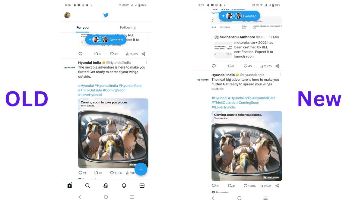 Twitter पर अब यूजर्स को फुल-स्क्रीन कॉन्टेंट एक्सपीरियंस मिलेगा। दरअसल, माइक्रोब्लॉगिंग साइट ट्विटर ने अपने प्लेटफॉर्म पर फुल-स्क्रीन कॉन्टेंट को इनेबल कर दिया है। यह एक्सपीरियंस आपको स्क्रॉलिंग के वक्त मिलने वाला है। कंपनी ने इस अपडेट को फेज मैनर में रोलआउट किया है। फिलहाल, ट्विटर के लेटेस्ट Android वर्जन पर इस बदलाव को देखा गया है। वहीं, कुछ यूजर्स को अब भी पुराने जैसा स्क्रॉलिंग एक्सपीरियंस मिल रहा है। संभावना है कि आने वाले समय में उन यूजर्स को भी यह अपडेट प्राप्त हो। आइए जानते हैं डिटेल्स। और पढें: X App का बड़ा अपडेट, आया ड्राफ्ट सिंक फीचर, मिलेगा ये कामाल का फायदा