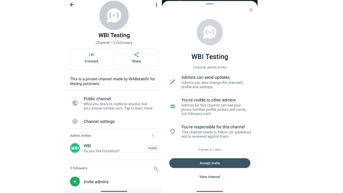 स्क्रीनशॉट में देखा जा सकता है कि नए अपडेट के बाद चैनल की इंफो स्क्रीन में चैनल ओनर को नए एडमिन इनवाइट करने की सुविधा मिलेगी। चैनल ओनर इनवाइट के जरिए अपने चैनल में 15 नए एडमिन को एड कर सकता है। हालांकि, एडमिन बनने के लिए उन यूजर्स को इनवाइट एक्सेप्ट करना होगा। और पढें: WhatsApp के Meta AI को टक्कर देने जल्द आ रहा है Arattai में Zia AI, Zoho CEO मणि वेंबु ने दी बड़ी जानकारी