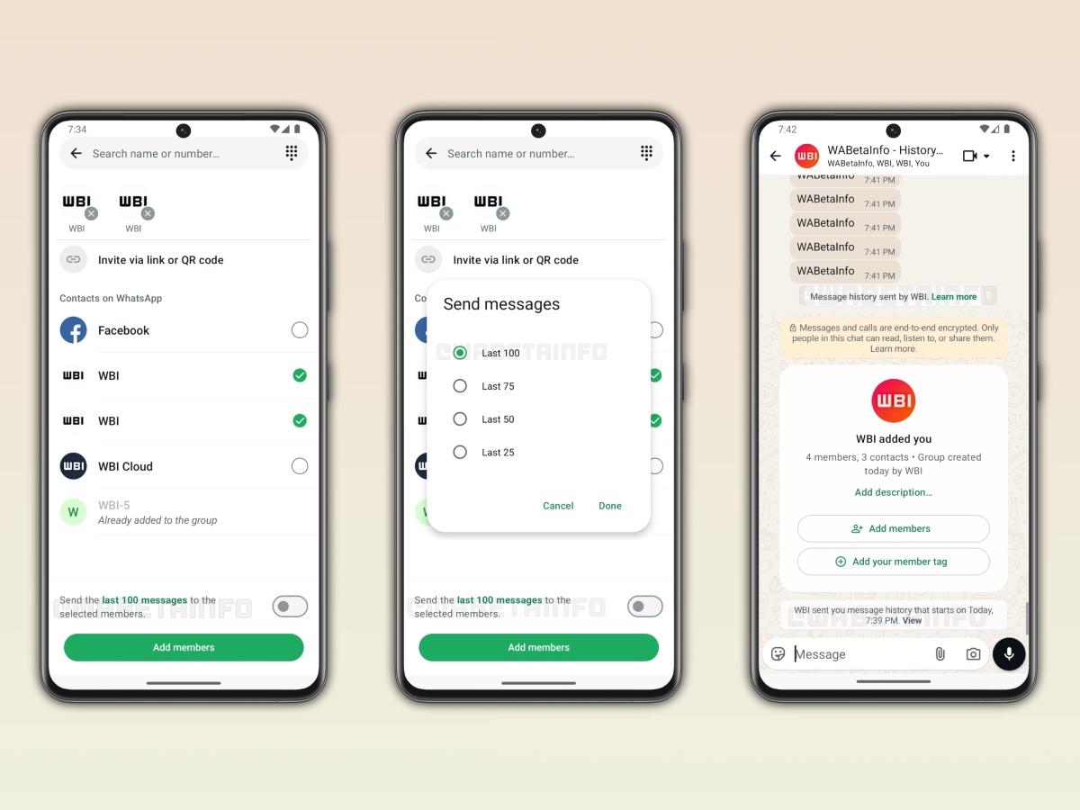 ऊपर लगे स्क्रीनशॉट को देखें, तो व्हाट्सएप के ग्रुप में चैट हिस्ट्री फीचर मिल रहा है। इसमें 25 से लेकर 100 मैसेज तक के ऑप्शन दिए गए हैं। इन्हें यूजर्स अपने हिसाब से सिलेक्ट करके शेयर कर सकते हैं। इसके लिए व्हाट्सएप पिछले 14 दिनों में किए गए मैसेज को कलेक्ट करके हिस्ट्री के फॉर्म में बना देता है।