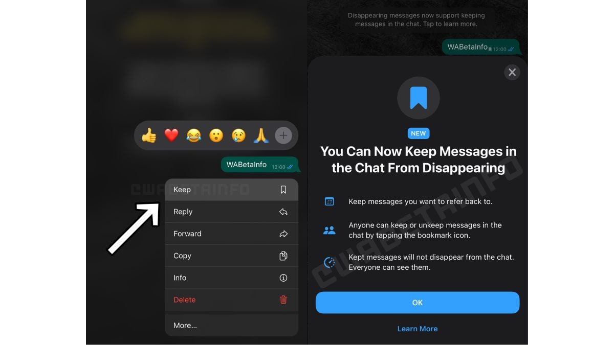 स्क्रीनशॉट में देखा जा सकता है कि Disappearing मैसेज टॉगल ऑन होने के बाद भी यूजर्स मैसेज को सहज कर रख सकेंगे। इसके लिए उन्हें चैट मैसेज पर keep का ऑप्शन दिया गया है। यह Kepp का ऑप्शन यूजर्स को रिप्लाई, फॉरवर्ड, कॉपी, इंफो, डिलीट व More ऑप्शन के साथ दिखेगा। अगर आप किसी मैसेज को keep करेंगे, तो वो मैसेज आपकी चैट से गायब नहीं होगा। और पढें: WhatsApp के Meta AI को टक्कर देने जल्द आ रहा है Arattai में Zia AI, Zoho CEO मणि वेंबु ने दी बड़ी जानकारी