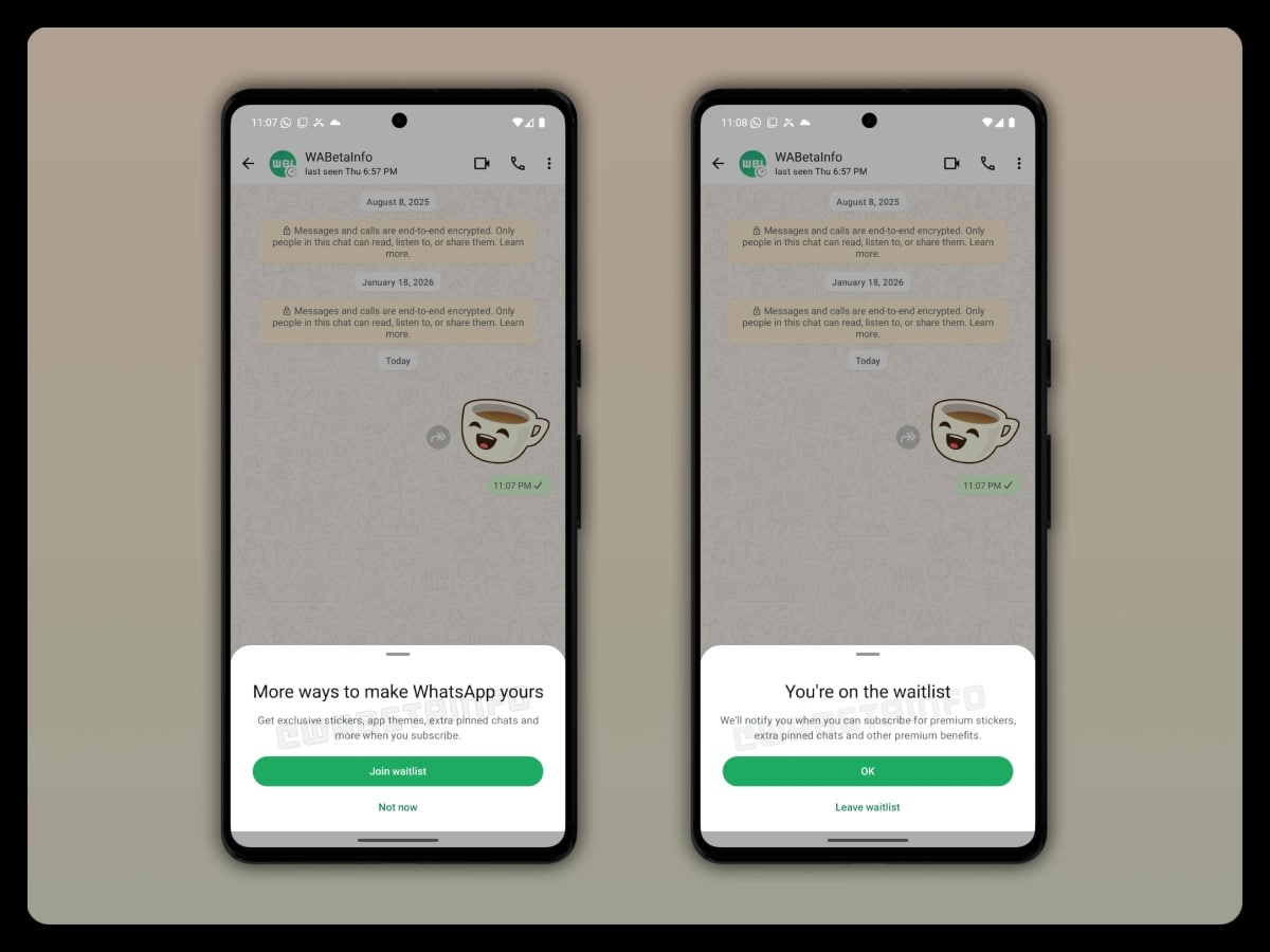 WABetaInfo की लेटेस्ट रिपोर्ट में WhatsApp beta for Android version 2.26.4.8 वर्जन का हवाला देते हुए नए ऑप्शन सब्सक्रिप्शन प्लान की जानकारी दी गई है। कई बीटा यूजर्स को व्हाट्सऐप पर एक पॉप-अप मैसेज देखने को मिला है, जिसमें लिखा है कि यूजर्स को एक्सक्लूसिव स्टिकर ऐप, ऐप थीम, एक्स्ट्रा चैट पिन करने जैसी सुविधा पाने के लिए सब्सक्राइब करने की जरूरत पड़ेगी। और पढें: WhatsApp पर Unknown नंबर से नहीं आएगी कॉल, बस करें ये काम