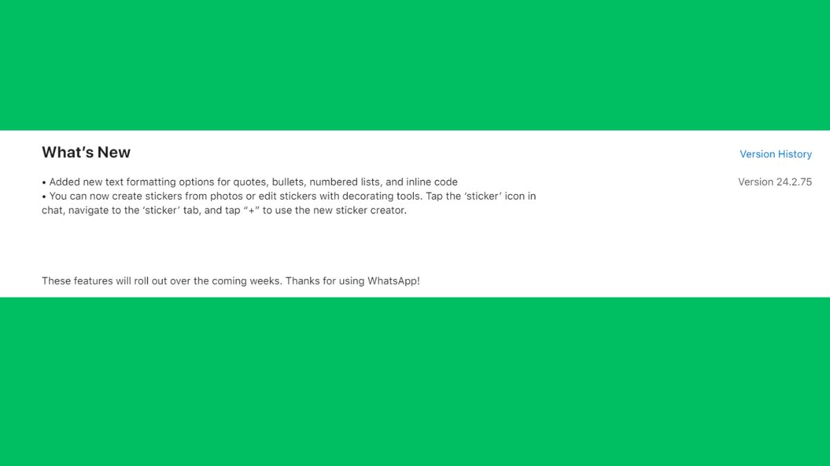 App Store पर WhatsApp for iOS 24.2.75 अपडेट रिलीज किया गया है। इस अपडेट के जरिए यूजर्स को कुछ नए फीचर्स मिले हैं, जिसकी जानकारी अपडेट चैंजलॉग में दी गई है। इन्हीं नए फीचर्स में Text Formatting फीचर शामिल हैं। जैसे कि हमने बताया इस नए फीचर के जरिए व्हाट्सऐप पर यूजर्स के टेक्स्ट मैसेज का फॉर्मेट पहले से बेहतर होगा। अब वह अपने टेक्स्ट मैसेज में कोट्स, बुलेट्स, नंबर लिस्ट और इन-लाइन कोड फॉर्मेंटिंग का इस्तेमाल कर सकेंगे।
