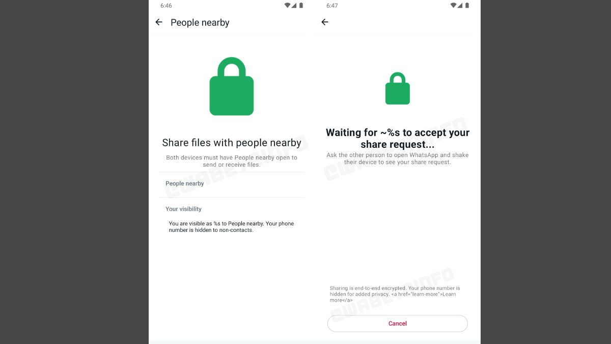 रिपोर्ट में दिए गए स्क्रीनशॉट के अनुसार, भविष्य में आस-पास के लोगों के साथ आसानी से फाइल कर पाएंगे। इस स्क्रीनशॉट से पता चलता है कि फाइल भेजने और रिसीव करने वाले दोनों यूजर्स को इस सेक्शन को ओपन करना होगा। ऐसा लग रहा है कि शेयर रिक्वेस्ट जेनरेट करने के लिए यूजर्स को डिवाइस शेक करना होगा। यह ध्यान रखना जरूरी है कि शेयरिंग एंड-टू-एंड एन्क्रिप्टेड है। इसका मतलब यह है कि व्हाट्सऐप चैट के बाहर और अज्ञात नेटवर्क वातावरण में भी फाइल शेयर करना सुरक्षित रहता है।