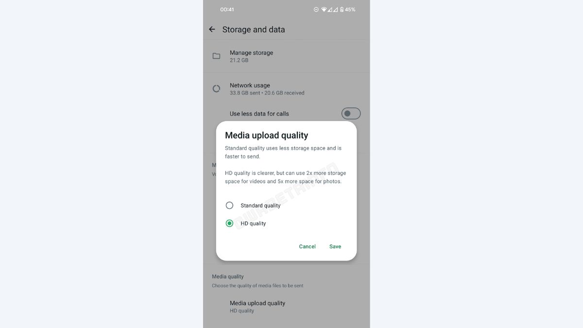 स्क्रीनशॉट के मुताबिक, व्हाट्सऐप यूजर्स को एक नया ऑप्शन मिलेगा, जिससे वे सिलेक्ट कर पाएंगे कि उ्हें मीडिया किस क्वालिटी में अपलोड करनी है। यहां से वे डिफॉल्ट रूप से मीडिया अपलोड के लिए HD सिलेक्ट कर पाएंगे। इसके अलावा, जब यूजर्स ड्राइंग एडिटर के भीतर मीडिया क्वालिटी को मैन्युअली एडजस्ट करना चाहते हैं तो व्हाट्सऐप अपने आप पिछली सेटिंग को सिलेक्ट करके अंतिम ऑरप्शन को बनाए रखेगी।