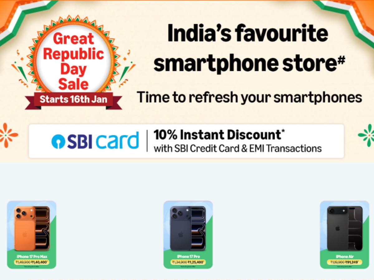 Amazon India ने अपनी Great Republic Day Sale 2026 की घोषणा कर दी है, जो 16 जनवरी 2026 से शुरू हो रही है। इस सेल में ग्राहकों को लेटेस्ट स्मार्टफोन्स और मोबाइल एक्सेसरीज पर शानदार डील्स मिलेंगी। Apple, OnePlus, Samsung, iQOO, Xiaomi, realme और Lava जैसे बड़े ब्रांड्स के प्रीमियम और बजट स्मार्टफोन्स पर भारी छूट, बैंक ऑफर्स, एक्सचेंज डील्स और नो-कॉस्ट EMI का फायदा उठाया जा सकता है। Amazon का कहना है कि इस बार की सेल में ग्राहक 60,000 रुपए तक का एक्सचेंज ऑफर, 12 महीने तक की नो-कॉस्ट EMI और SBI क्रेडिट कार्ड पर 10% तक की इंस्टेंट छूट का लाभ ले सकते हैं।