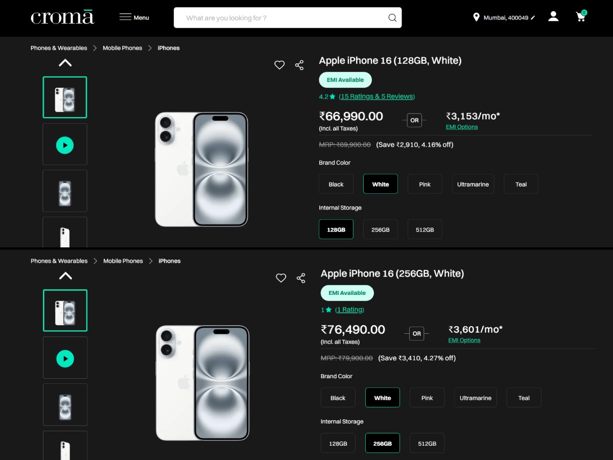 Croma पर iPhone 16 के बेस मॉडल 128GB के लिए कीमत ₹66,990 है, जो इसके असली दाम ₹69,900 से कम है। वहीं 256GB और 512GB मॉडल की कीमतें ₹76,490 और ₹99,900 हैं अगर आप ICICI Bank, IDFC First Bank या SBI के क्रेडिट कार्ड से खरीदते हैं तो आपको ₹4,000 का इंस्टेंट डिस्काउंट मिलेगा। इसका मतलब है कि 128GB मॉडल सिर्फ ₹62,990 में मिल सकता है और कुल ₹6,900 की बचत होगी। EMI पर भी यही ₹4000 का डिस्काउंट मिलता है।