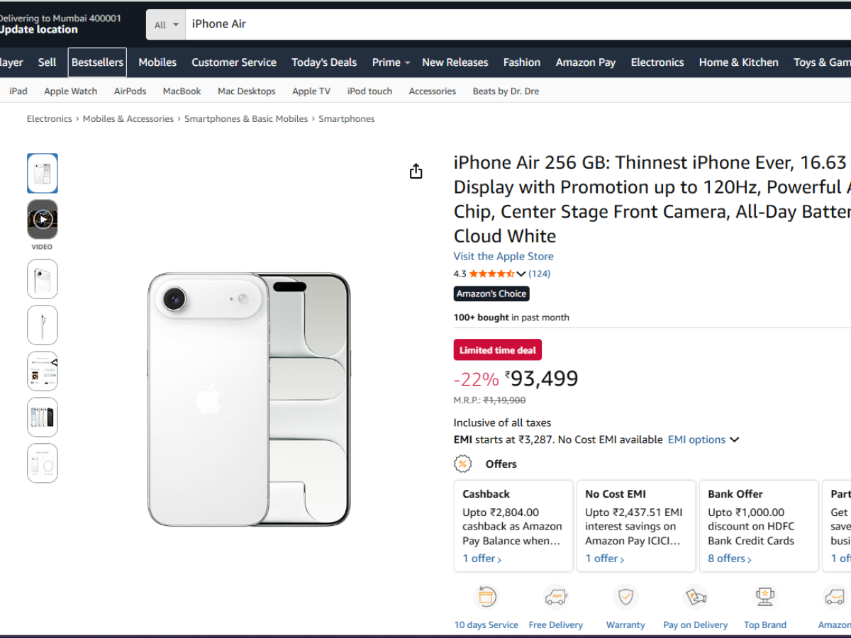 इस सेल के दौरान iPhone Air पर 29,400 रुपये से ज्यादा का डिस्काउंट दिया जा रहा है। भारत में इस फोन की लॉन्च कीमत 1,19,900 रुपये थी, लेकिन फिलहाल Amazon पर यह फोन करीब 93,499 रुपये में लिस्ट किया गया है। इसके अलावा बैंक ऑफर का फायदा उठाकर ग्राहक और भी ज्यादा बचत कर सकते हैं। अगर आप HDFC Bank के क्रेडिट कार्ड से EMI पर पेमेंट करते हैं तो आपको अतिरिक्त 3000 रुपये की छूट मिल सकती है। इतना ही नहीं अगर आपके पास पुराना स्मार्टफोन है तो आप उसे एक्सचेंज करके कीमत को और कम कर सकते हैं।