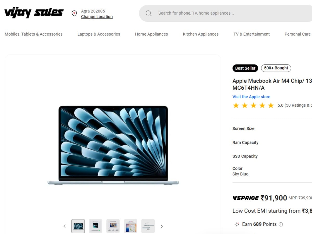 MacBook Air M4 का 16GB RAM और 256GB SSD वाला वेरिएंट लॉन्च के समय 99,900 रुपये में आया था। Vijay Sales पर यही मॉडल अब 91,900 रुपये में लिस्टेड है यानी सीधे 8000 रुपये की छूट। इसके अलावा अगर आप ICICI बैंक, SBI बैंक या IDFC First Bank के योग्य क्रेडिट कार्ड से पेमेंट करते हैं, तो आपको 10,000 रुपये तक का इंस्टेंट डिस्काउंट और मिल सकता है। इन दोनों छूटों को जोड़ने पर लैपटॉप की कीमत करीब 81,900 रुपये रह जाती है। हालांकि यह ऑफर सीमित स्टॉक और कुछ खास कलर ऑप्शन्स तक ही है, जिनमें Sky Blue कलर खासतौर पर शामिल बताया जा रहा है। और पढें: Diwali से पहले Apple MacBook Air M4 की कीमत में भारी गिरावट, FlipKart-Amazon नहीं सिर्फ यहां मिलेगी ये डील
