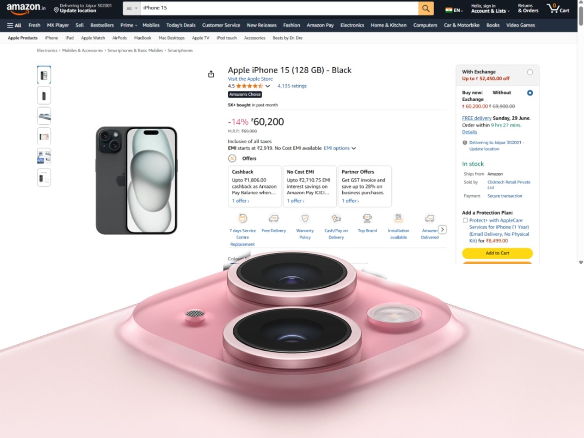 अगर आप काफी समय से iPhone खरीदने की सोच रहे हैं तो अब आपके लिए एक बेहतरीन मौका है। Apple के लेटेस्ट मॉडल iPhone 15 पर अमेजन एक शानदार ऑफर लेकर आया है। एप्पल स्टोर पर इस फोन की कीमत 69,990 रुपये है, लेकिन अमेजन पर यह करीब 60,200 रुपये में मिल रहा है। यानी आप बिना किसी ऑफर के ही सीधे 10,000 रुपये की बचत कर सकते हैं। यह ऑफर उन ग्राहकों के लिए बेहद फायदेमंद है जो एक प्रीमियम स्मार्टफोन खरीदना चाहते हैं लेकिन कम कीमत में।