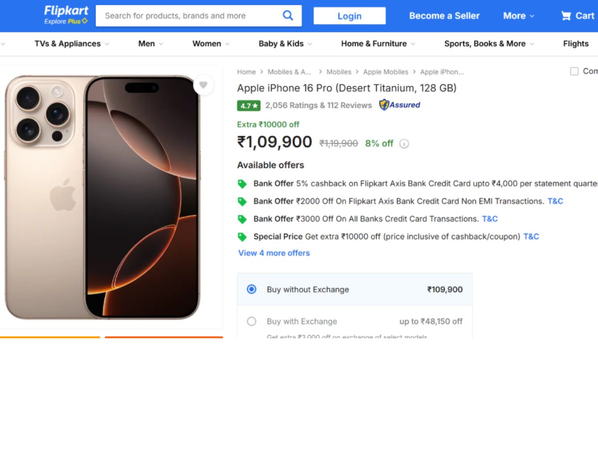 अगर आप Flipkart से iPhone 16 Pro या Pro Max खरीदना चाहते हैं तो आपके लिए कई बढ़िया ऑफर मिल रहे हैं।