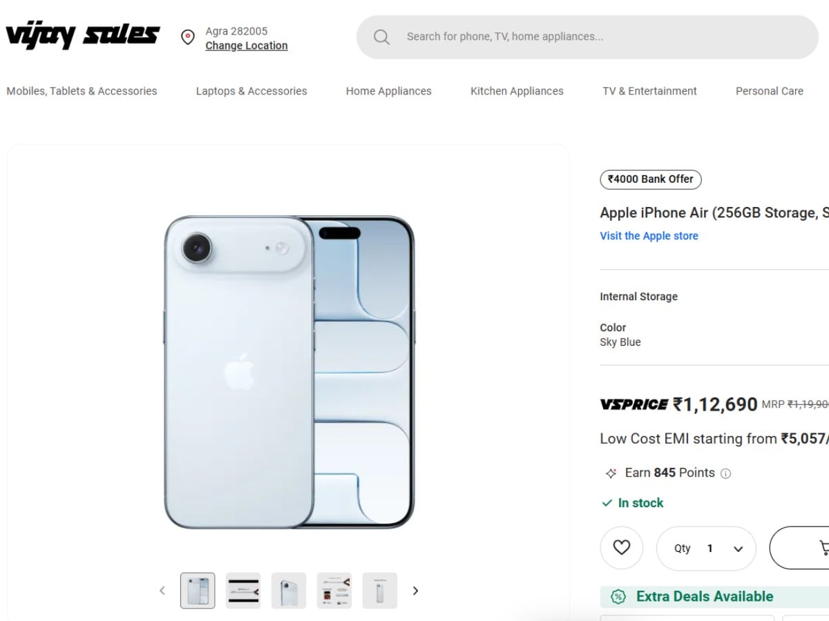Vijay Sales पर iPhone Air पर 12,000 रुपये से ज्यादा की छूट मिल रही है। यह iPhone Apple का सबसे पतला और हल्का मॉडल है, जिसे इस साल iPhone 17 सीरीज के साथ लॉन्च किया गया था। पहले इसकी शुरुआती कीमत 1,19,900 रुपये थी लेकिन अब इसे 1,12,690 रुपये में खरीदा जा सकता है। इसके अलावा एक्सचेंज ऑफर और बैंक डिस्काउंट भी मिल रहे हैं। ICICI कार्ड यूजर्स को 5000 रुपये का तुरंत डिस्काउंट मिलेगा, जबकि SBI और IDFC FIRST बैंक के नो-कॉस्ट EMI पर 4000 रुपये की छूट मिलती है। और पढें: Apple iPhone Air की कीमत में आई गिरावट, जानें कहां मिल रहा है इतना सस्ता