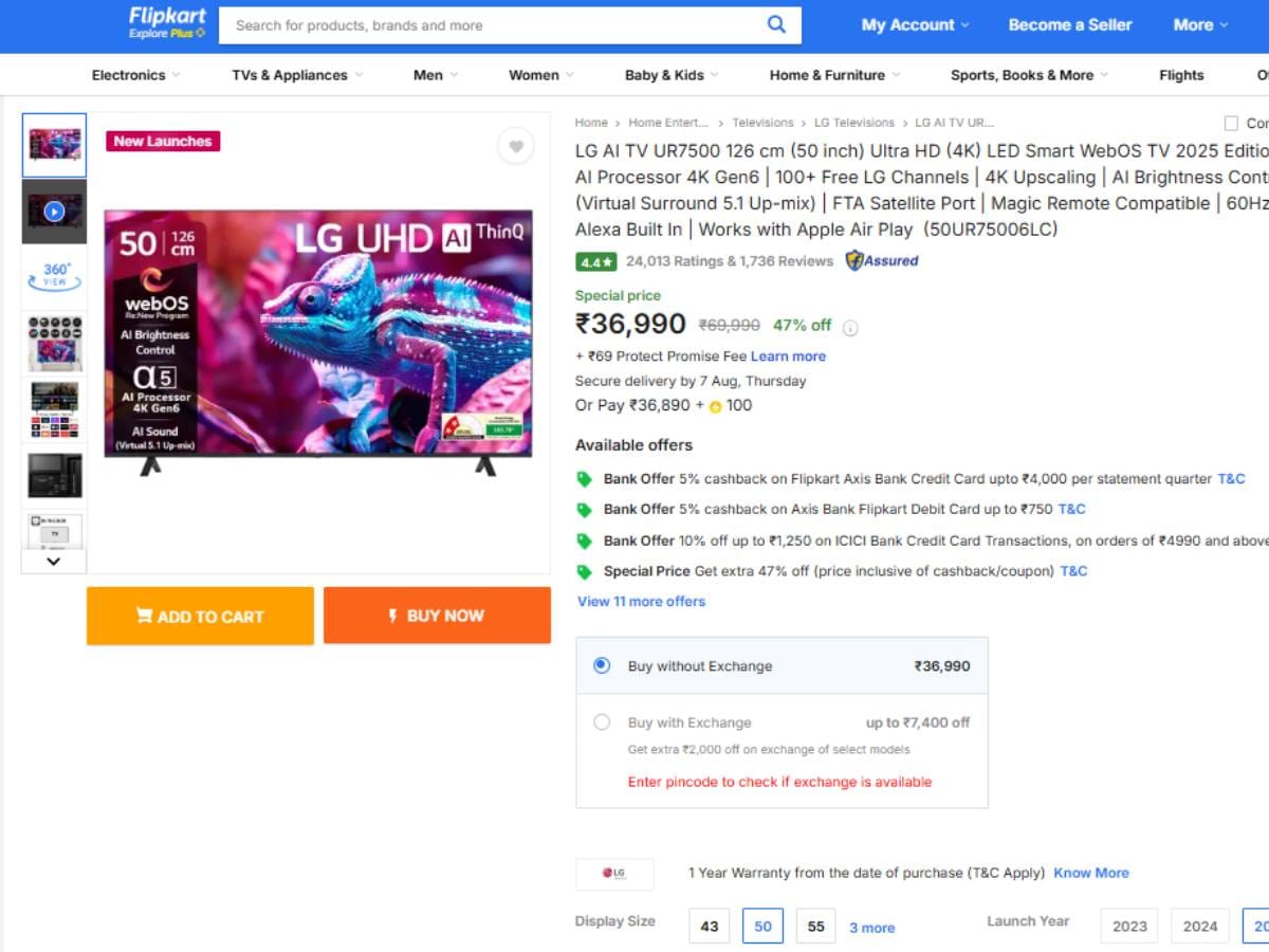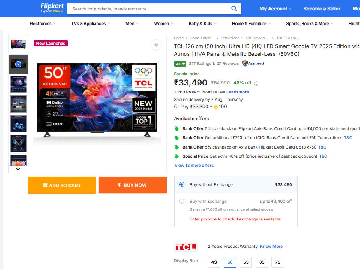 अगर आप लंबे समय से एक बड़ा और शानदार स्मार्ट टीवी खरीदने का सोच रहे थे, तो अब आपको और इंतजार करने की जरूरत नहीं है। FlipKart की फ्रीडम सेल में 50 इंच के Smart TV पर ऐसी जबरदस्त डील्स मिल रही हैं, जो शायद आपको दोबारा ना मिलें। LG, Sony, Samsung, TCL और Acer जैसे भरोसेमंद ब्रांड्स के टीवी पर भारी छूट दी जा रही है। कुछ टीवी तो ₹26,000 से भी कम में मिल रहे हैं। आइए जानते हैं कौन से हैं वो 5 बेस्ट डील्स जो आपकी जेब जेब को ज्यादा ढीली नहीं करेंगी। और पढें: GOAT सेल से भी बड़ी हो सकती है Flipkart Freedom Sale, इस तारीख से होगी शुरू