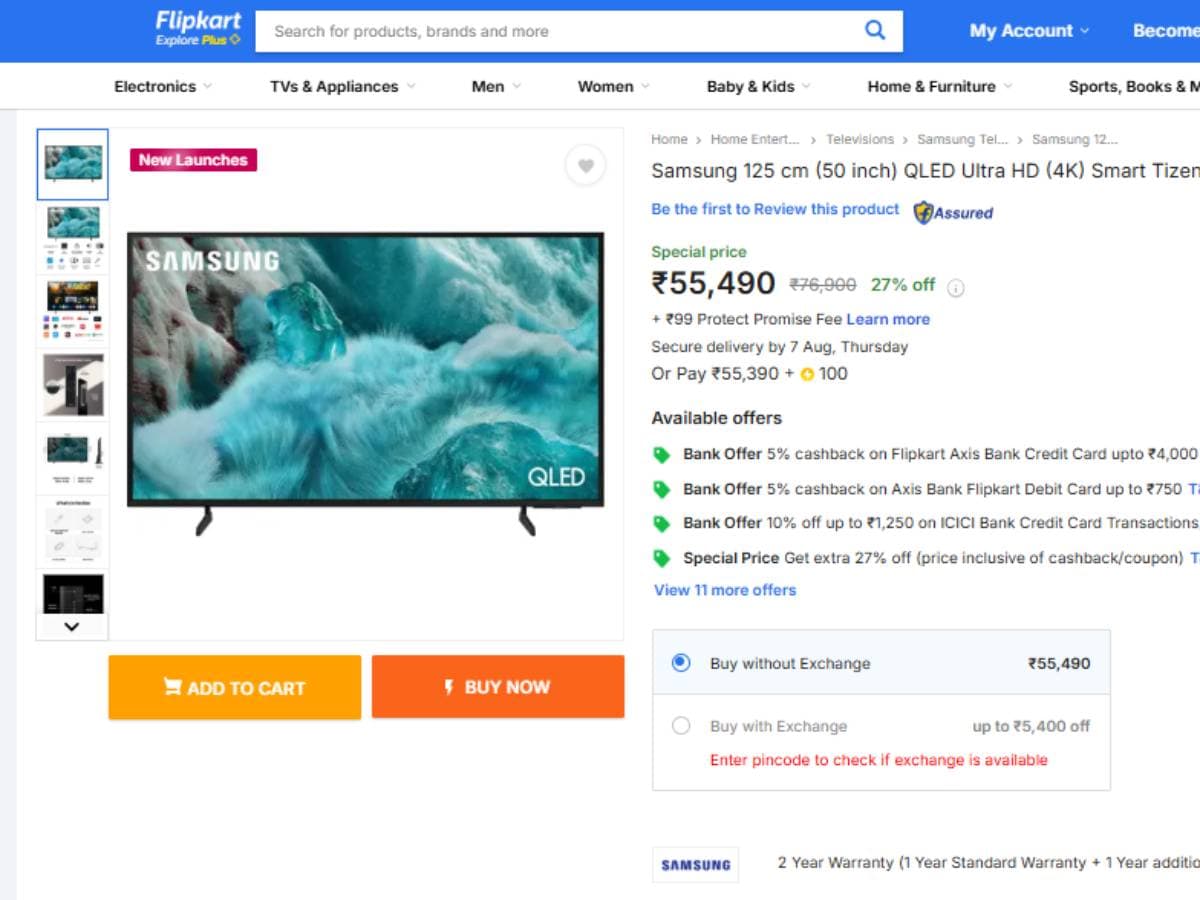SONY BRAVIA का यह 50 इंच का 4K स्मार्ट टीवी प्रीमियम क्वालिटी और शानदार पिक्चर के लिए जाना जाता है। सेल में इसकी कीमत ₹56,999 है। ICICI बैंक के EMI ऑप्शन पर ₹1500 की छूट और लंबी EMI पर ₹2000 तक का डिस्काउंट मिल सकता है। पुराने टीवी के बदले ₹7900 तक का एक्सचेंज डिस्काउंट भी है। ध्यान रहे ये ऑफर 7 अगस्त तक ही वैलिड है।