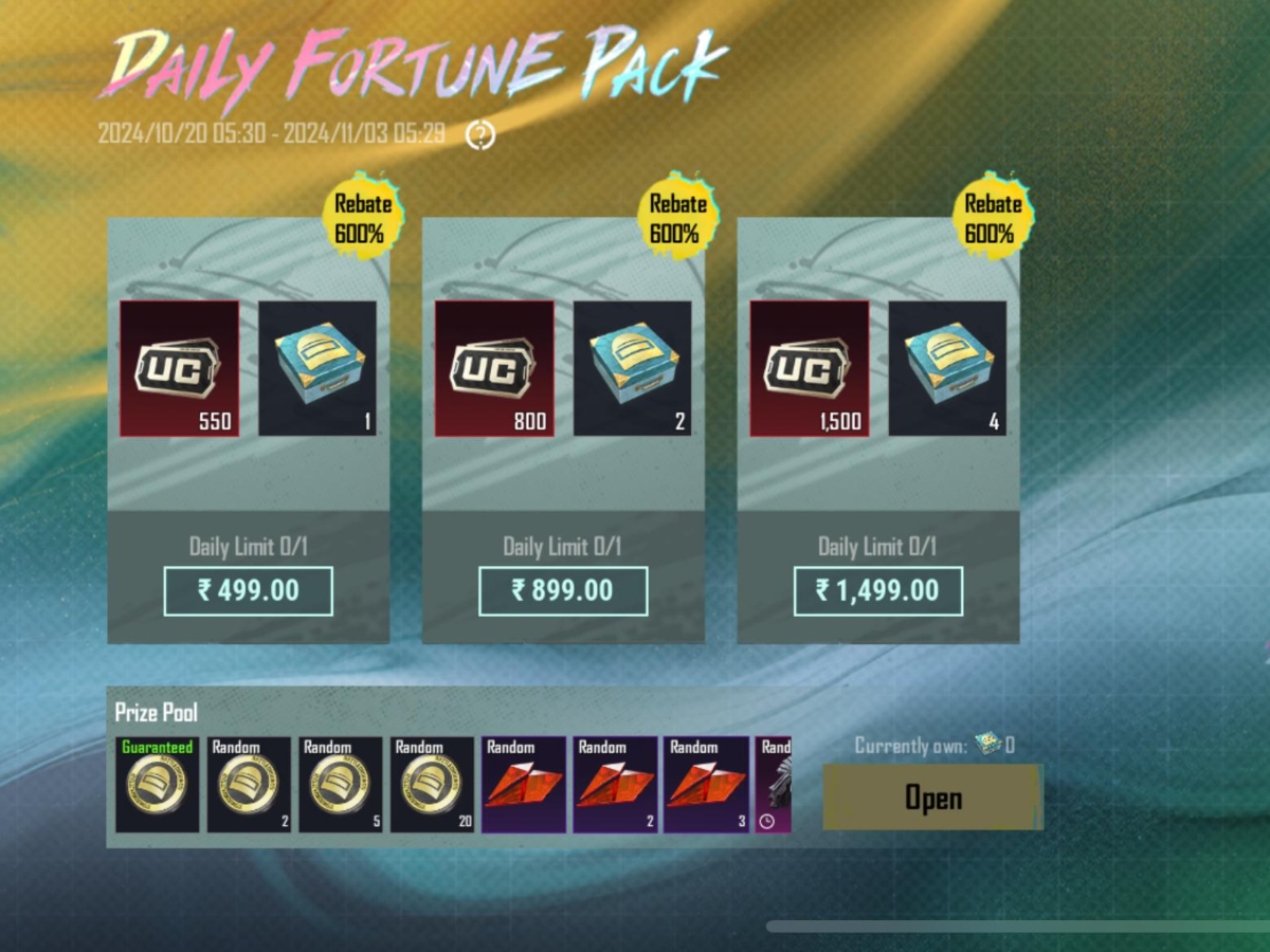 बीजीएमआई के Daily Fortune Pack को 20 अक्टूबर को लाइव किया गया था, जो 11 नवंबर तक चलेगा। इसमें 499 रुपये, 899 रुपये और 1499 रुपये का पैक मिल रहा है। इसके पहले पैक में 550UC-1 Fortune Bag, दूसरे पैक में 800 UC-2 Fortune Bag और तीसरे पैक में 1500 UC-4 Fortune Bag दिए जा रहे हैं।