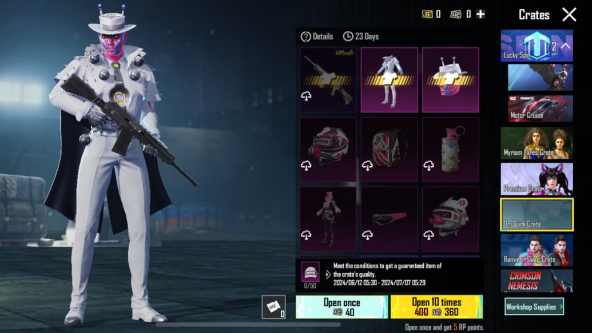 Dr. Quirk क्रेट से रिवॉर्ड पाने के लिए गेमर्स को UC खर्च करने होंगे। इसमें 1 बार क्रेट ओपन करने के लिए 40UC और 10 बार ओपन करने के लिए 360 UC खर्च करने होंगे।