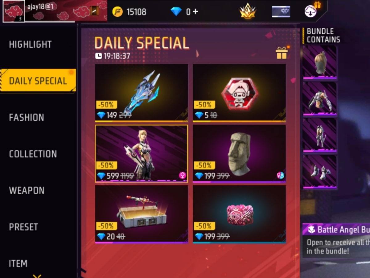 3. Battle Angel को डेली स्पेशल में 599 डायमंड में उपलब्ध कराया गया है। इसकी असली कीमत 1199 डायमंड है।