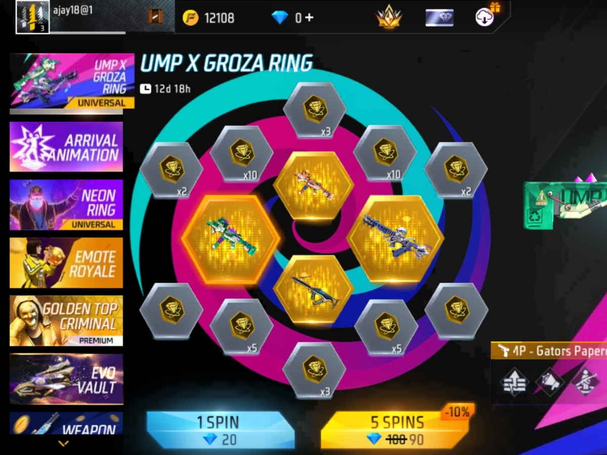 Free Fire Max में जारी हुआ UMP X GROZA RING बेहद खास है। यह इवेंट गेमर्स के लिए अगले 12 दिन तक लाइव रहेगा। इस बीच गेमर्स स्पिन करके Bony Tunes और Gators Papercut जैसी शानदार वेपन स्किन के साथ Universal Ring Token को प्राप्त कर सकेंगे।