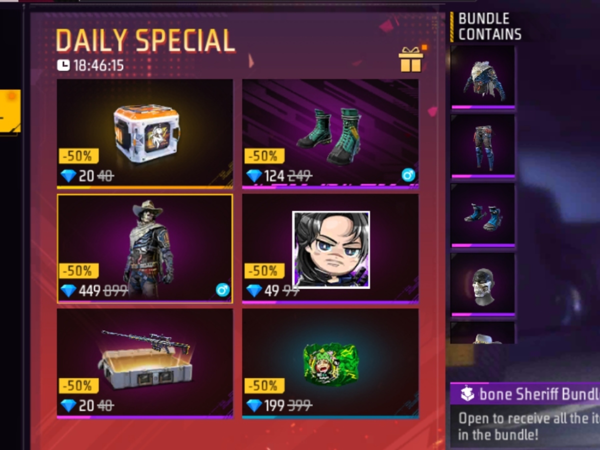 - Brokebone Sheriff बंडल डेली स्पेशल सेक्शन में 449 डायमंड में उपलब्ध है, जिसकी असल कीमत 899 डायमंड है।