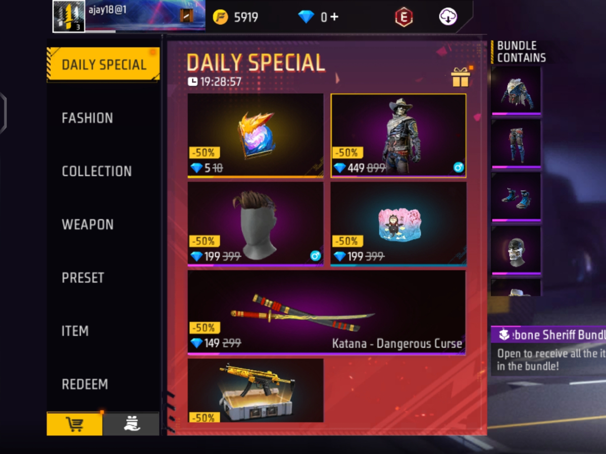 Free Fire Max में Brokebone Sheriff बंडल मिल रहा है, जिसे खिलाड़ी आधी से कम कीमत में खरीद सकते हैं। इसके अलावा, Daily Special स्टोर में वेपन स्किन और हेयर स्टाइल जैसे आइटम्स भी सस्ते में मिल रहे हैं।