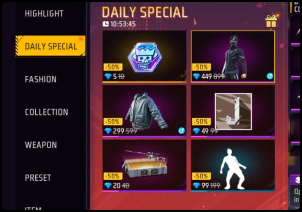 Free Fire Max में Daily Special स्टोर डेली अपडेट होता है। इस स्टोर में गेम डेवलपर कंपनी रोजाना नए-नए आइटम्स को एड करती है, जिसे आप हाफ रेट में पा सकते हैं। दरअसल, इस स्टोर पर मिलने वाले सभी इन-गेम आइटम्स पर 50 प्रतिशत डिस्काउंट मिलता है, जिसके बाद उन आइटम्स को आधी कीमत में खरीद सकते है। जैसे कि हमने बताया आज इस स्टोर से आप Deep Aqua Bundle, Shimmy Emote व Classic Jazz Jacket को आधी कीमत में पा सकते हैं। यहां देखें सभी आइटम्स की लिस्ट।