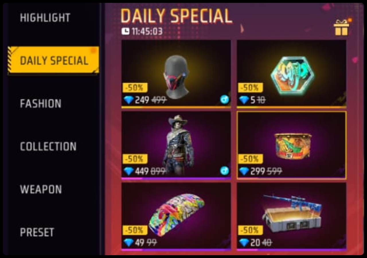 Free Fire Max में Daily Special सेक्शन अपडेट हो गया है। यहां से आप आज आधे Diamonds में Brokenbone Sheriff Bundle और Stick No Bills Gloo Wall Skin आदि को आधी कीमत में पा सकते हैं।