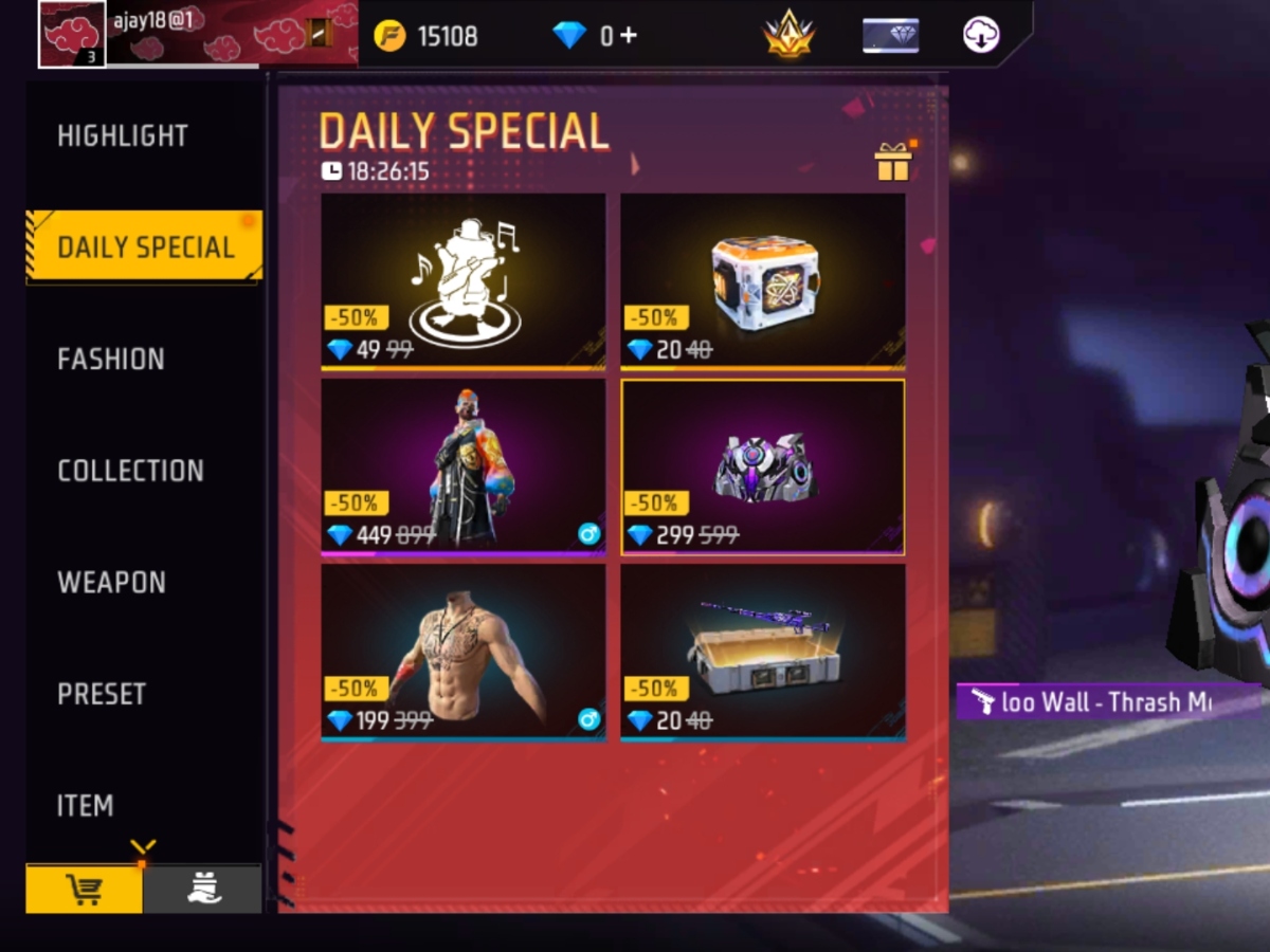 Free Fire Max Daily Special: फ्री फायर मैक्स का डेली स्पेशल बहुत खास है। आज इस स्पेशल स्टोर में Thrash Metallic ग्लू वॉल स्किन और Lucky Koi बंडल जैसे कई शानदार आइटम मिल रहे हैं, जिन्हें आप आधे डायमंड में खरीद सकते हैं।