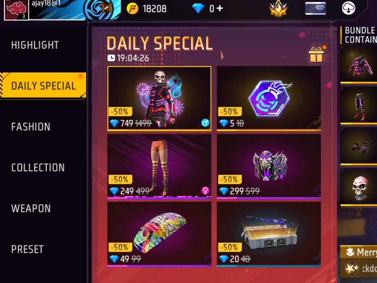 1. Merry in the bones Bundle की असली कीमत 1499 डायमंड है, लेकिन इसे डेली स्पेशल से 749 डायमंड में अनलॉक किया जा सकता है।