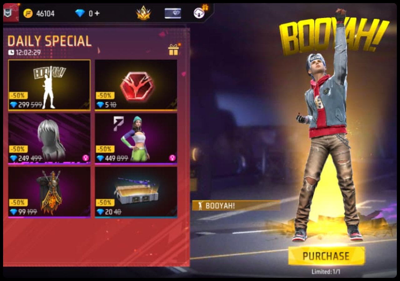 Free Fire Max के Daily Special आज Booyah Emote मिल रहा है, जिसे आप हाफ Diamonds में पा सकते हैं। इसके अलावा, आज बंडल और वेपन लूट क्रेट को भी आधे दाम में पाया जा सकता है।