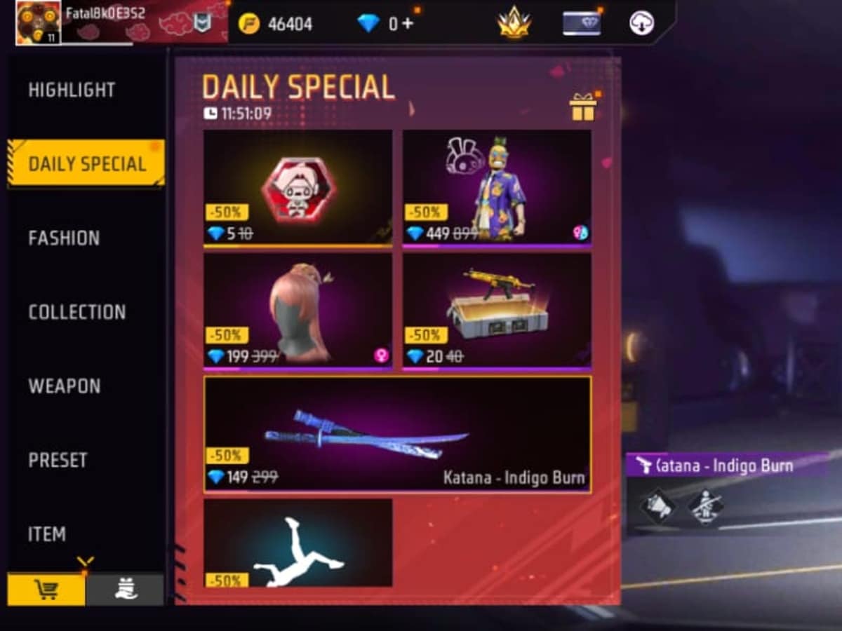 5. Katana-Indigo Burn स्किन का असली दाम 299 डायमंड है। हालांकि, इस स्किन को 149 डायमंड में परचेज किया जा सकता है।