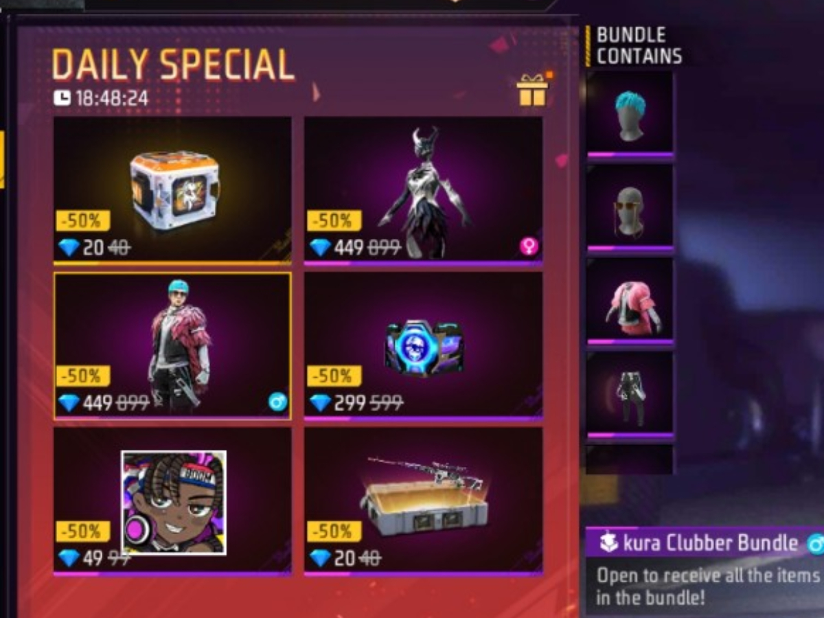 Free Fire Max गेम का आज का Daily Special स्किन व बंडल लवर्स के लिए है। इसमें प्रीमियम Sakura Clubber बंडल के साथ-साथ लूट क्रेट और ग्लू वॉल स्किन मिल रही है, जिन्हें डिस्काउंटेड रेट पर खरीदा जा सकता है। आपको बता दें कि यह गेम का सबसे पॉपुलर स्टोर है। यहां गेम में मिलने बंडल, इमोट, वेपन लूट क्रेट आदि को आधे दाम में खरीदा जा सकता है। इसे गेमर्स के लिए रोजाना अपडेट किया जाता है।
