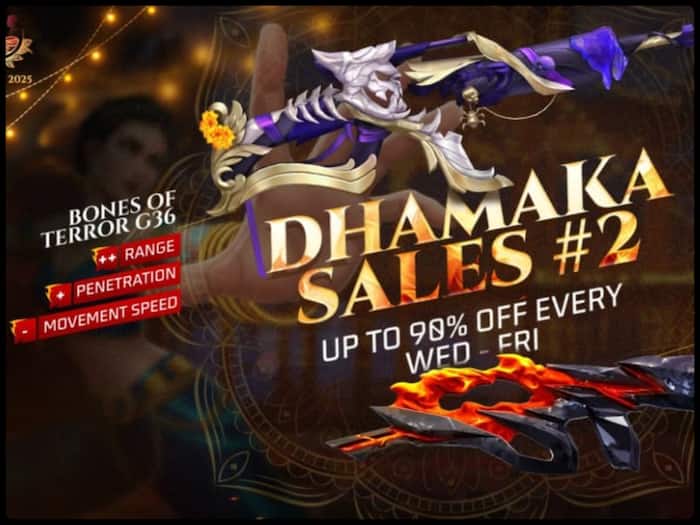 Free Fire Max में Dhamaka Sale इवेंट लाइव हो गया है। इस इवेंट के जरिए प्लेयर्स को G36 Bones of Terror गन स्किन फ्री पाने का तगड़े डिस्काउंट में पाने का मौका मिल रहा है। दरअसल, यह एक तरह का डिस्काउंट इवेंट है। इस इवेंट में हिस्सा लेने के लिए आपको अपने सामने चलने वाले व्हिल को Stop करना होगा। जैसे ही आप व्हिल को स्टॉप करेंगे, वैसे ही आपके सामने एक नंबर आ जाएगा। जो भी नंबर आपके सामने होगा, उतना डिस्काउंट आपको इस इवेंट में मिलने आइटम्स पर प्राप्त होगा। जैसे कि हमने बताया इस इवेंट में आपको प्रीमियम गन स्किन के साथ-साथ कई अन्य आइटम्स फ्री मिलेंगे। और पढें: Free Fire Max में 1000 गोल्ड कॉइन और दिवाली का अनार मिल रहा फ्री, ऐसे करें Claim