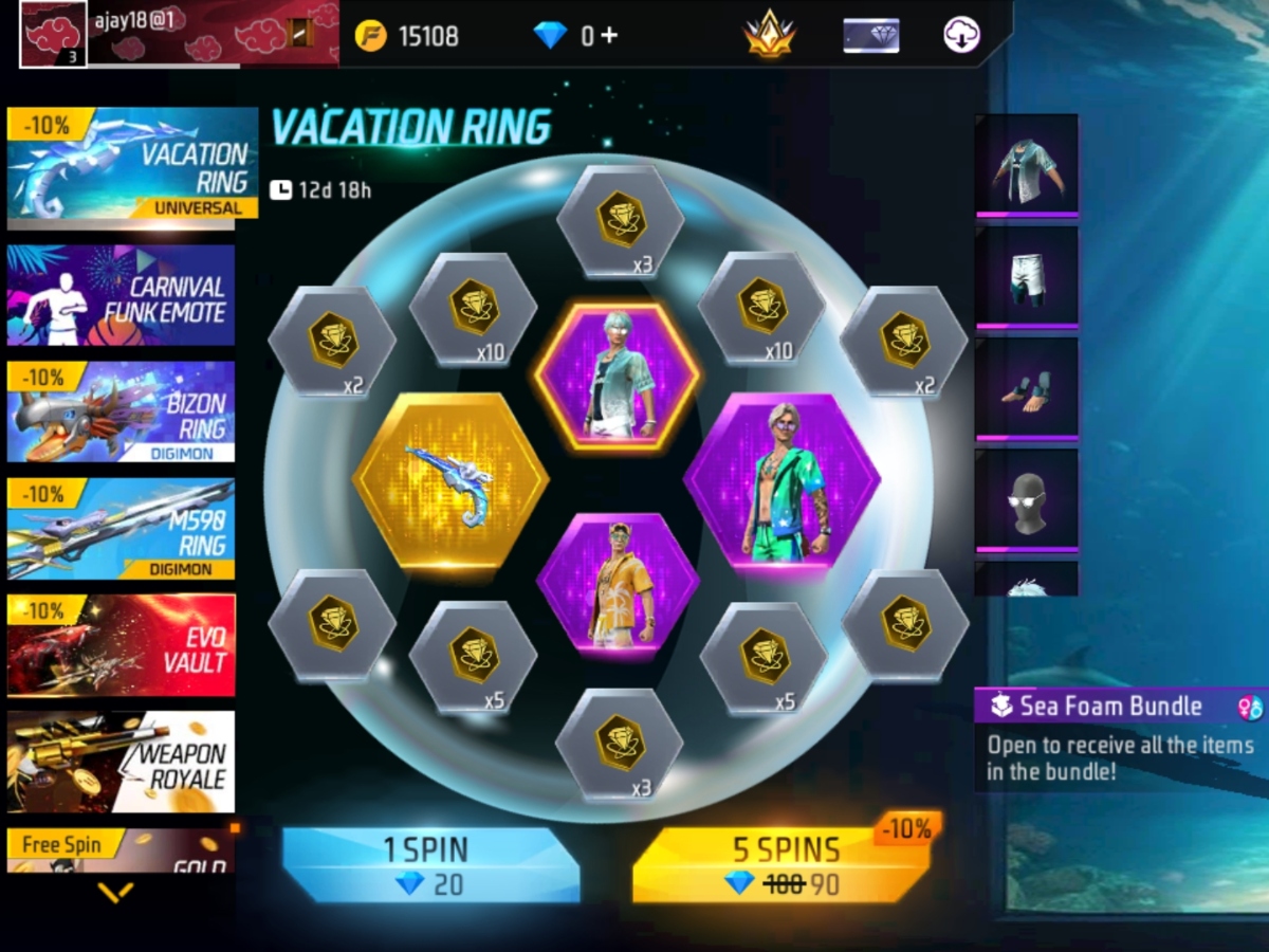 Free Fire Max में Vacation Ring इवेंट चल रहा है। इस स्पेशल इवेंट को खासतौर पर बंडल लवर्स के लिए लाया गया है। इसमें Sea Foam और Briny Shore जैसे शानदार बंडल मिल रहे हैं।