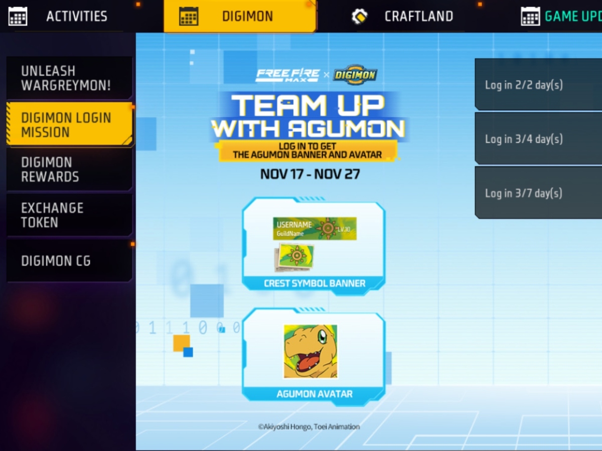 Free Fire Max का लॉग-इन मिशन एक टास्क बेस्ड इवेंट है। इसमें टास्क पूरे करके शानदार रिवॉर्ड्स पाए जा सकते हैं। इसमें 1000 गोल्ड कॉइन, Crest Symbol बैनर और Agumon Avatar फ्री में मिल रहा है। यह इवेंट गेमर्स के लिए 27 नवंबर तक लाइव रहेगा। आपको बता दें कि इस गेमिंग इवेंट को 17 नवंबर 2025 को लाइव किया गया था।