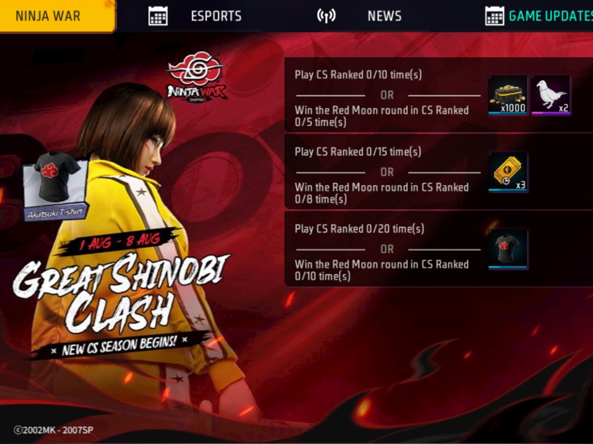 फ्री फायर मैक्स का Great Shinobi Clash गेमर्स के लिए लाइव है। यह 8 अगस्त 2025 तक जारी रहेगा। इस बीच गेम में मिलने वाले कुछ टास्क को पूरा करके गोल्ड रॉयल वाउचर और 1000 गोल्ड कॉइन हासिल किए जा सकते हैं। इसके साथ टी-शर्ट व Detonating Clay Bird को क्लेम करने का मौका मिल रहा है।